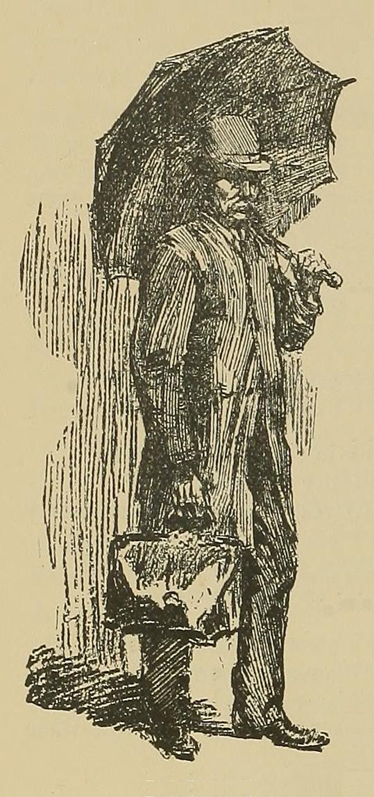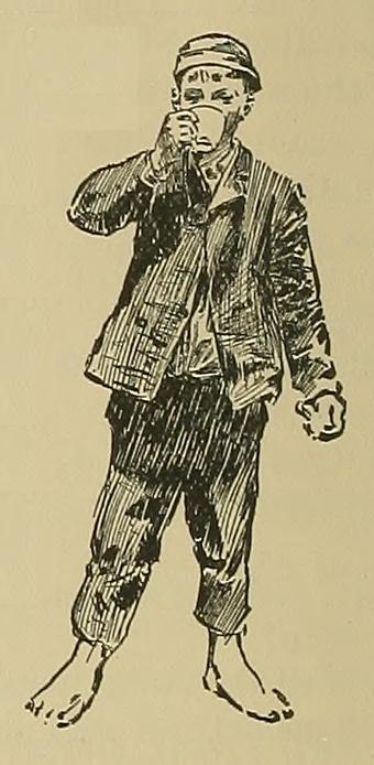 “At the Lunch Stand” is Whittier’s “Barefoot Boy,” transferred to the city. His lips are not “redder still, kissed by strawberries on the hill;” nor may he be coated with “outward sunshine,” or full of “inner joy.” The luxurious bowl of milk and bread which our Quaker poet describes, is not his, even with the wooden dish and pewter spoon; but he seems happy for the moment with the cup of more or less hot coffee which he imbibes. His jaunty, independent attitude shows that he is bound to get all the good of his powerful and perhaps palatable beverage; that he earned it, and is entitled to it.