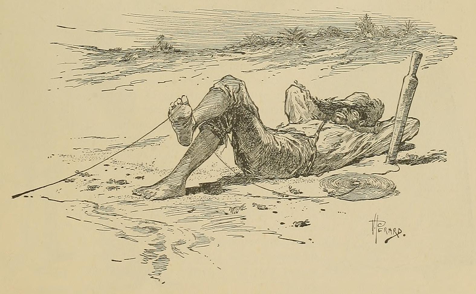 The lazy fisherman who has hung out his latch-string and is waiting for a dinner to call upon him, is Perard with a godsend of material—of the kind he likes. There could scarcely be found a better wedding of shiftlessness and ingenuity. The primitive character of the man’s garments is apparently not due to the climate alone; he takes no thought of the morrow, and not much of the current day, so far as its temporal affairs are concerned. But the crude marks of mechanical ability are all over and around him; one suspender is induced, by its oblique trend, to do service for two; an elaborate coil of line gives opportunity of play for the largest of fin-bearers; the stick in the sand guarantees that his expected caller shall not go away without experiencing the fisherman’s peculiar hospitality; and there is considerable chance that if a “bite” occurs, the line will waken him, as it gradually warms the interstice between his toes.