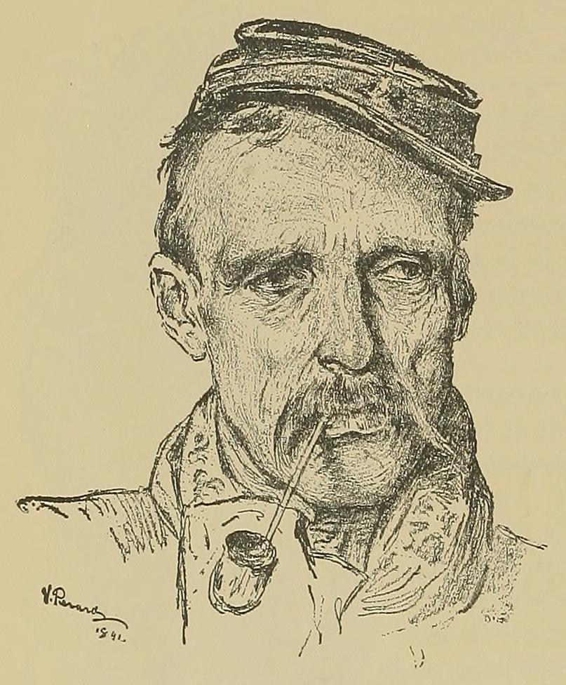 “A Veteran of the Ranks” might almost be Kipling’s Mulvaney himself. The fatigue-cap, which in its jaunty pose seems to have vegetated and grown there; the drooping mustache; the capacious pipe; are all what might have been characteristics of that renowned Hibernian warrior of India. The picture finally centres, however, in the eyes; which contain a world, or at least two hemispheres, of shrewdness, of that sort which only gets about so far in life, but is terribly correct within its own scope. They also possess a certain humanity and generosity, which would be likely to act as winsome daughters of his regiment of martial qualities, even upon the battle-field.