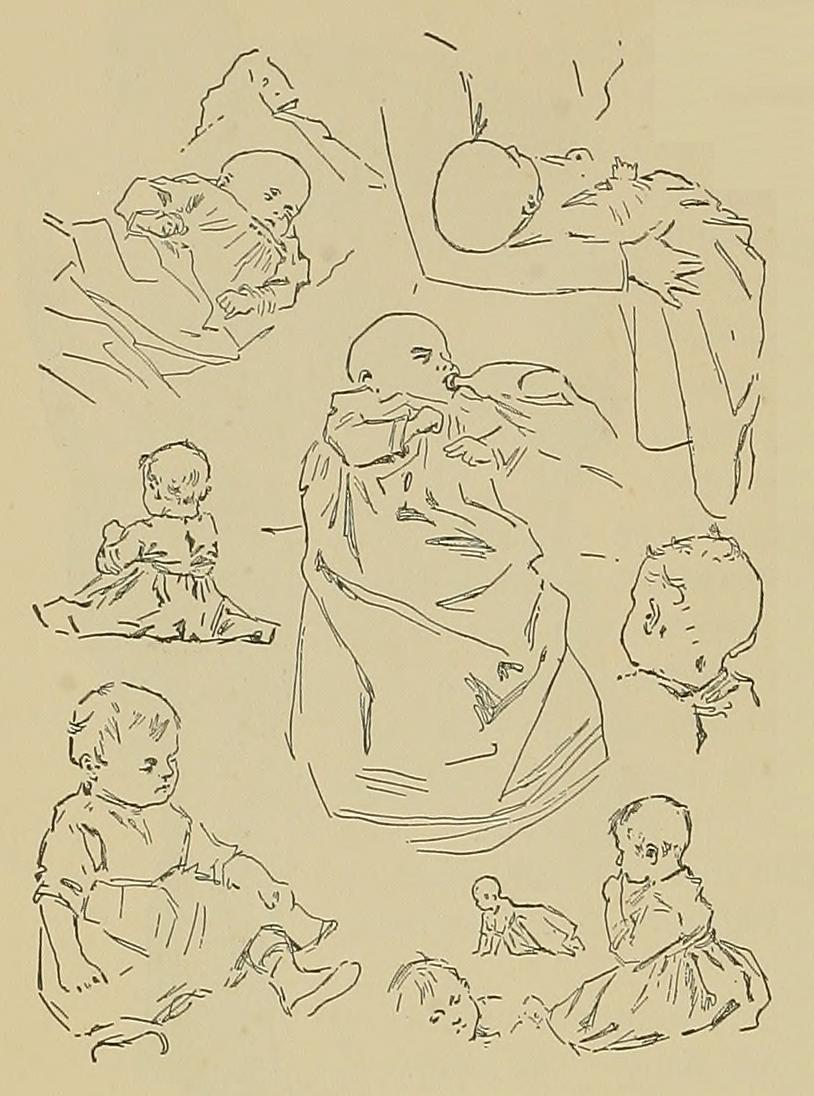 “Miniature Men and Women” include a number of the most interesting of the genus Baby. As everyone knows, there are babies and babies, except to the parents of one. The infant is the true teacher and object-lesson combined; it shows us the grace, although not always the mercy and peace, of unconscious action. It has not been away from Heaven long enough to learn the deceit of this crooked world, is unaware that there is anything in life to conceal, and acts accordingly, until taught better, or, perhaps, worse. These babies, or this baby (for the same infant has so many different ways of acting and appearing, that these may all be pictures of the same) can be said to exhibit grace in every attitude and every position, from the symmetrical fragment of humanity on the mother’s arm, to the tot just contemplating a walking-lesson. All of them have a dignified simplicity.