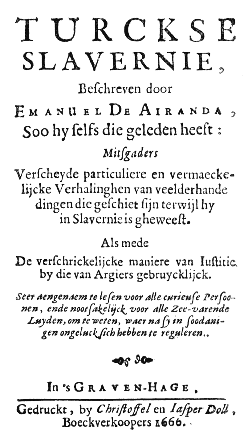 Dit is een Nederlandse bewerking van het boek Relation de la captivité, et liberté du sieur Emanuel de Aranda, mené Eſclave à Alger en l’an 1640. & mis en liberté l’an (kopie bij Google books), dat in 1656 verscheen bij Jean Mommart in Brussel.