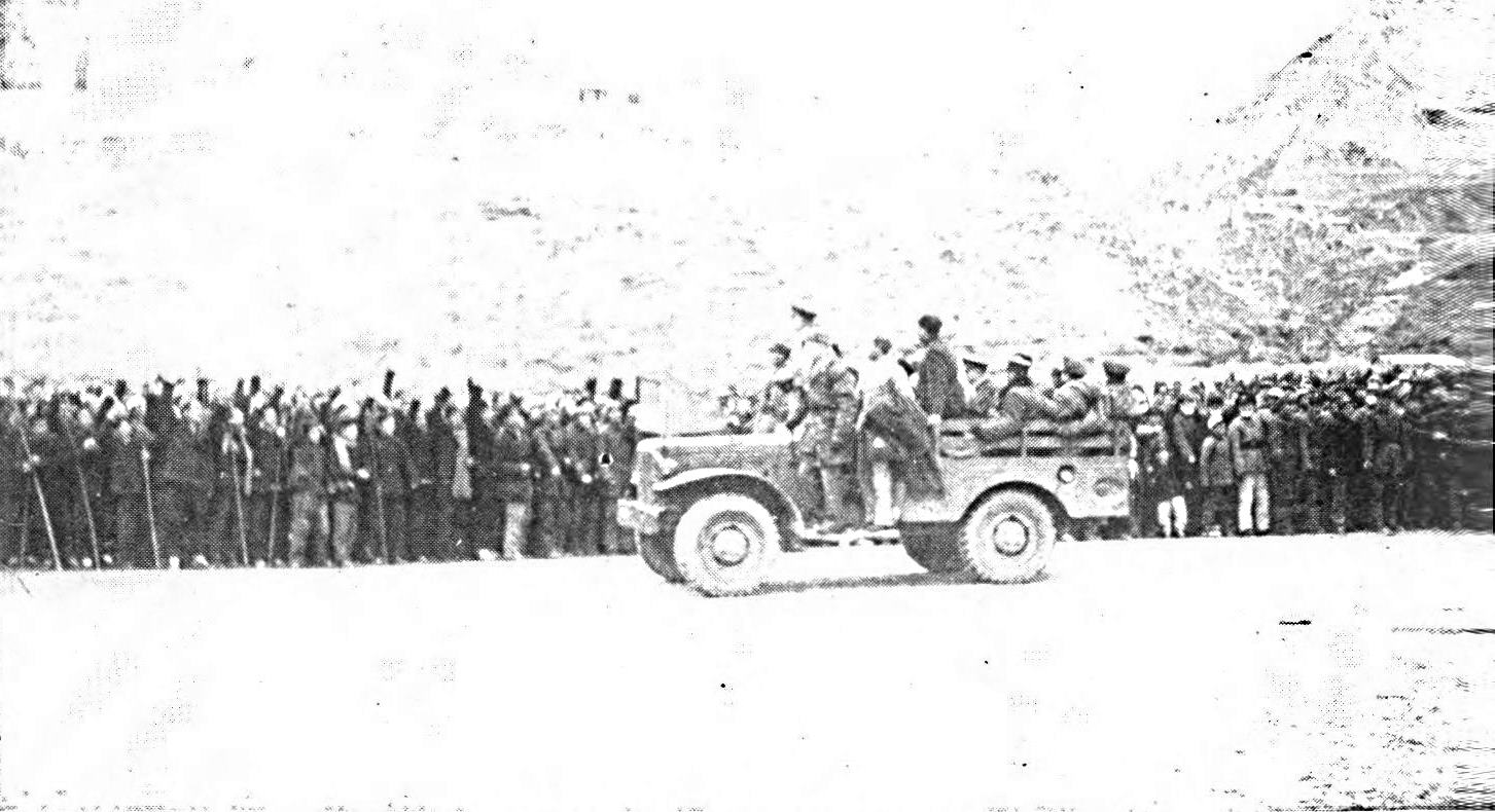 On Marshall’s arrival at the Airport of Yenan, he was greeted with pomp and ceremony by every military unit the Communists could muster. Welcomed[Pg 13] enthusiastically by stocky Mao Tse-tung, in his coarse homespun peasant’s garb, suave Chou En-lai, in the snappy uniform of a three-star General, and Chu Teh, wearing a Russian soldier’s fur-lined cape, he accompanied his colorful and grateful hosts on an inspection of the troops. The Cadets from the Communist Military Academy, who had hiked in some fifty or sixty miles in order to form the Guard of Honor, were the best dressed and best outfitted of all the troops in the Communist Army. While spartanly clad in coarse but neat dark blue uniforms, they gave every evidence of superb leadership and discipline. Especially trained and selected, these Cadets became the equivalent, in Communist China, of the Soviet NKVD, or uniformed police troops.