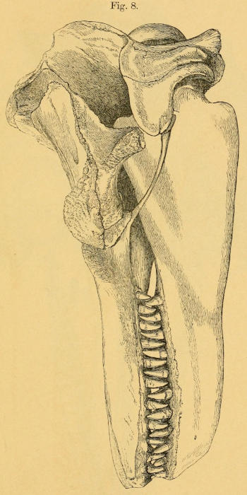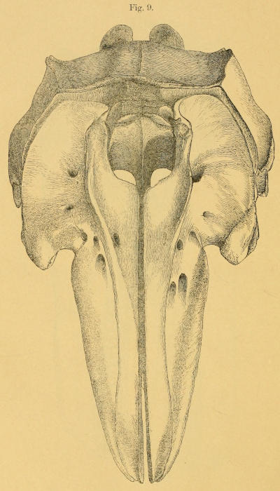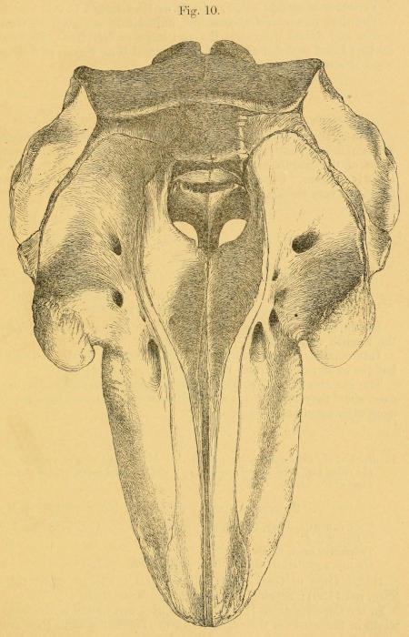 “This is the skull of a young animal. A groove containing a strong ligament connecting the muscle of the forehead with the snout is deeply imbedded in the intermaxillary groove. The snout is described as long and flexible. Atlas and axis anchylosed. Length of cervical vertebræ 3⁷⁄₁₀ inches. Scapula, longitudinal diameter 10 inches, transverse diameter 6 inches. Paddles, length 14 inches, width 3½ inches. Hyoid arch 5½ × 4 inches high. Pelvic bones 2½ inches.
