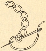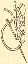 Dropping Picots.—These dropping picots are a little more solid in appearance than the plain picots. Make five chain; withdraw the hook from the loop and insert it in the second of the five chain stitches just made; take up the loop dropped; pass the thread over the needle and draw it through the two loops; repeat with five chain; drop the last loop; insert in second chain; take up the dropped loop; put the thread over the hook and draw through both loops. Continue in this way for the length required.