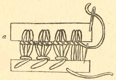 Point de Venise (Fig. 62 a).—This can be worked on to baby garments, or to any article where a dainty finish is required. It looks even better if the heading is of some of the lace braids. The thread is secured at the edge and a looped stitch is taken as a foundation thread into which are worked four button-hole stitches—to form a scallop. This charming edging is much used in point de Venise. The same stitch also makes a beautiful filling pattern.