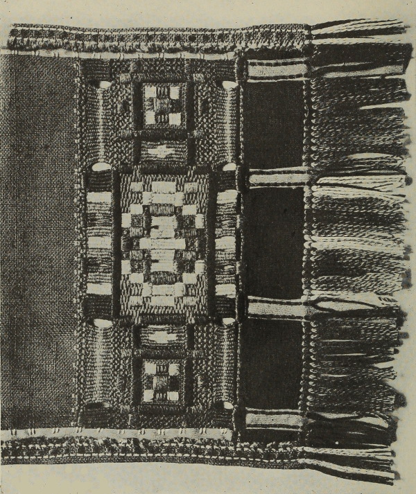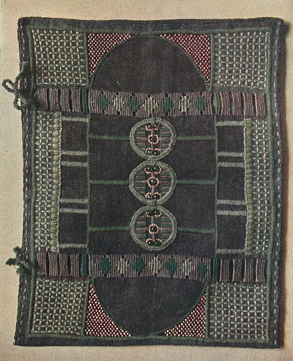A Cushion Case (Plate XVI.).—The original is a charming piece of work. The background, of a soft blue tone, is worked in blues, bright greens, heliotrope and cream. The design, in straight lines and circles, has two bars of needle-weaving, the definite pattern of which is shown to advantage by the plain woven bars on either side. The bars are worked similarly to the latchet darns which are frequently used instead of rings to support the draw strings of bags.