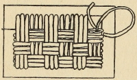 The design is so simple that it might be drawn directly on to the material—this should not be a difficult matter if the threads of the canvas are regularly woven. Put in the main lines first—in the illustration these lines are worked in satin stitch; use a ruler and a chalk pencil—the latter is easily rubbed out if a mistake is made—then run in the design in wool or thread. Measure off the bars for needle-weaving, but do not cut and draw the threads until ready to work them. Great care must be taken in planning out the various parts of the design to have all lines running accurately with the warp and weft of the material, otherwise, when the woven bars are[Pg 171] put in, they will accentuate any mistake made. The corners are in “laid” stitch, that is, the threads are stretched loosely across from one side of the square to the other, horizontally, then vertically—or vice versâ; they are then sewn down at the junctions with tiny cross stitches, which requires some care if the squares are not to be displaced. The rows of running or tacking stitches accentuate the oval in the centre. Cut and draw the threads for the needle-weaving after the outer band of satin stitch has been worked. The plain bars should be worked in first, as they are simpler in construction. When these plain bars are finished, divide up the strands into groups of seven for the pattern, and one group of eight—the latter forms the start and finish of the pattern which should have four groups in each. Weave in all the purple blocks to begin with; these, as may be seen from the illustration, are widest at the base. Weave over seven groups for one-eighth of the space; leave out a group of threads on either side and weave over five; then over three, and then over one group; each step is fully one-eighth in height. This process is then reversed, and the weaving finishes at the opposite side over seven groups. The start and finish over four groups can be followed from the illustration. The central figures alternating in green and blue will then be woven in without difficulty.