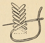 There are many simpler methods of filling leaf forms or oval spaces—a row of button-holing, point de Bruxelles (Fig. 52) worked round the inner edge, followed by[Pg 153] one or two rows of looped button-hole stitch (Fig. 53), and closed down the centre by a line of faggot, or Russian stitch, finally overcasting a few stitches to the edge in order to finish off the thread neatly.