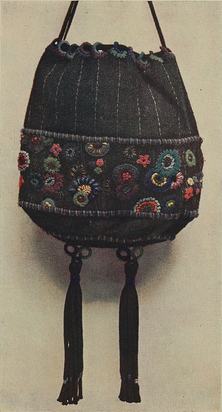 A Useful Bag.—Plate XIII. illustrates what may be done with such simple materials as canvas, braid and wool. The foundation of canvas has the design traced on to the material; it consists of a series of little circles and half-circles, which overlap here and there, and which are eventually turned into gay little conventional flowers by means of bright-coloured wools. These flowers are mostly worked in petal stitch (Fig. 3A), and French knots (Fig. 22A). The band is enclosed by two rows of braid, oversewn with green, blue and purple wool. The foot of the bag is made up of an oval of braid worked in rows from the centre outwards; the[Pg 154] tassels, also of braid, are brightened by rings and tags of wool; little thin lines of tinsel threads are darned into the canvas—these serve to connect the embroidered band with the upper decoration. The embroidered rings which hold the draw strings are extremely pretty. This note of originality, and indeed, the whole bag, conveys to one’s mind the impression of the bright personality of the worker who thus gives outward expression of the joy it gives her to work with her needle.