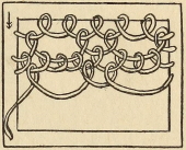 A pretty crochet edging suitable for finishing off many articles of personal wear or for domestic use, which wears and washes well, may be worked directly on to the material. Work a row of button-hole stitch into the edges of the material; space the stitches rather widely so as to allow of an easy entrance for the crochet hook—this makes a daintier edging than inserting the needle directly into the material. It is worked in three rows—a linen thread gives the best effect. To work the first row, begin with one double stitch into a button-hole loop, then two chain, and one double crochet into every second button-hole loop; on approaching the corners, work into every loop so as to allow the next row to lie easily round them—nothing spoils good work so much as to see the stitching tightened and strained round the edges and corners. When the first row is finished join the stitches with a single stitch and commence the second row. Make eight or ten chain according to the thread used and size of loop wanted, then work double crochet into every third or fourth loop of the previous row—give ease to the corners by working three double crochet into each loop at the finish of the row; join as in second row. For the third row work ten or twelve double crochet stitches over the chain loops, as these stitches should cover the chain loops closely, when they look similar to button-hole stitching. The appearance of this edging will naturally vary considerably according to the size of the needle and thread [Pg 169]used. A very serviceable edging, not too minute, is made with a No. 4 steel crochet hook and linen “L.C.” crochet thread, No. 14.