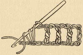 Double Stitch.—Double stitch is not very different from single stitch. Put the hook into the upper half of the third chain from the hook, as in single stitch; pass the wool over the hook and draw it through. There are now two loops on the hook. Pass the wool over again and draw it through these two loops; continue to the end of the chain and turn as in single stitch.