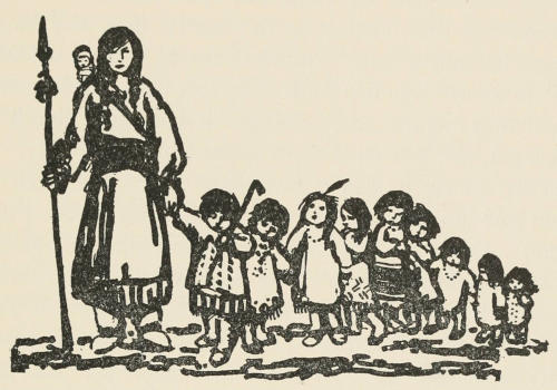 Just as the fun was at its liveliest, there was a mighty gurgle, and the fountain, which had been casting itself[14] so high into the air, sank suddenly into the earth. The oldest giantess of all gathered her great fluttering robes about her, and striding to the edge of the forest, pulled up a fir-tree with one wrench of her wrist.