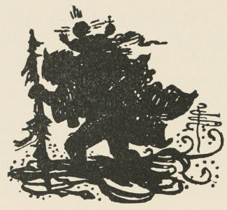 Ivan crept nearer. Through an opening between the trees he could see the giant’s great hands fumbling over his foot. With a piece of fur he was trying to stop a small cataract of blood that was bursting out from it. Every now and then, in his clumsy efforts, he seemed to hurt himself more, for he would throw back[7] his head and give the same deafening howl Ivan had heard before.