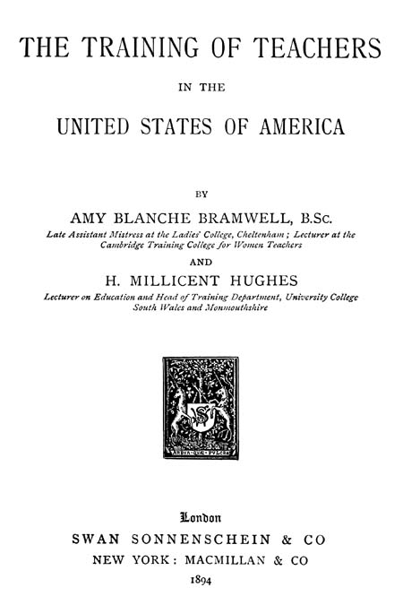 In view of the growing interest in secondary education in England, and the important educational problems demanding solution, the Gilchrist Trustees decided, in the early part of 1893, to send five women teachers to America for the purpose of studying and reporting upon Secondary Schools for Girls and Training Colleges for Women in different parts of the States. The Trustees made their intention widely known, and invited the governing bodies of the various women’s colleges and associations of teachers to submit to them names of persons specially qualified. Out of the list of able and experienced women teachers thus furnished to them, the Trustees, after careful consideration of the qualifications of the numerous candidates, selected the following five: Miss Bramwell, B.Sc., Lecturer at the Cambridge Training College; Miss Burstall, B.A., Mistress at the North London Collegiate School for Girls; Miss Hughes, Lecturer on[iv] Education at University College, Cardiff; Miss Page, Head-Mistress of the Skinners’ Company’s School for Girls, Stamford Hill, N.; and Miss Zimmern, Mistress at the High School for Girls, Tunbridge Wells. They were awarded travelling scholarships of one hundred pounds each to enable them to spend two months in the United States in prosecuting their enquiries. The five scholars visited America in the summer of 1893, and submitted to the Trustees carefully prepared Reports, two of which—viz., those by Miss Bramwell and Miss Hughes—are presented to the public in this volume. The Trustees have aided in the publication of these Reports because they believe that a knowledge of the educational systems and experiments which have been tried in America cannot fail to be of interest and value to those engaged in teaching in the United Kingdom.