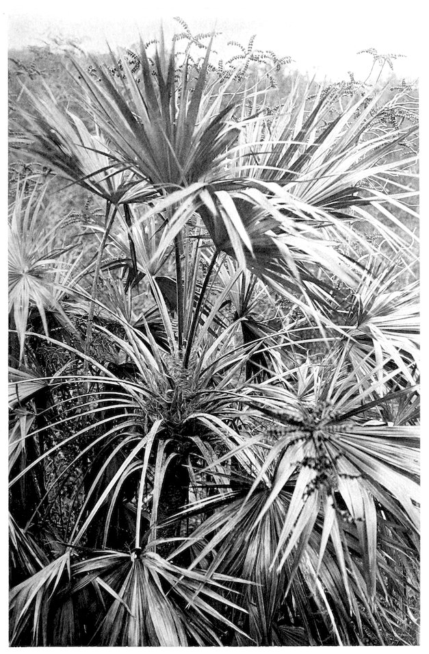 Although totally different on close inspection this genus has in Puerto Rico a superficial resemblance to the royal palm, which often deceives travelers. The similarity lies mostly in the two facts that both the royal and corozo palms are more robust and stiffly erect than the cocoanut, and that the leaf-divisions instead of lying 566horizontal and in one plane are tilted at different angles to the midrib, thus giving the foliage seen in the mass a somewhat unkempt appearance in comparison with the cocoanut.