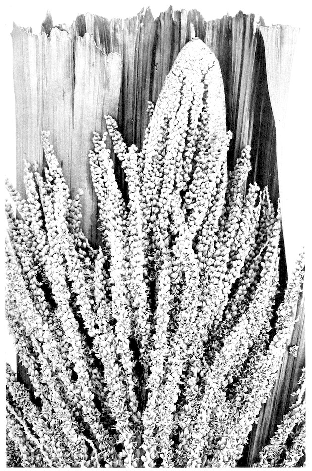 A third robust species of Inodes is growing in the conservatory of the Department of Agriculture labeled Sabal umbraculifera. It differs conspicuously from I. causiarum by the very large leaves and by the great development of fine brown fibers which fill all the interstices between the leaf-bases, and suggest the name Inodes vestita.[3] Photographs of both the species have been prepared for the illustration of comparative detailed descriptions.