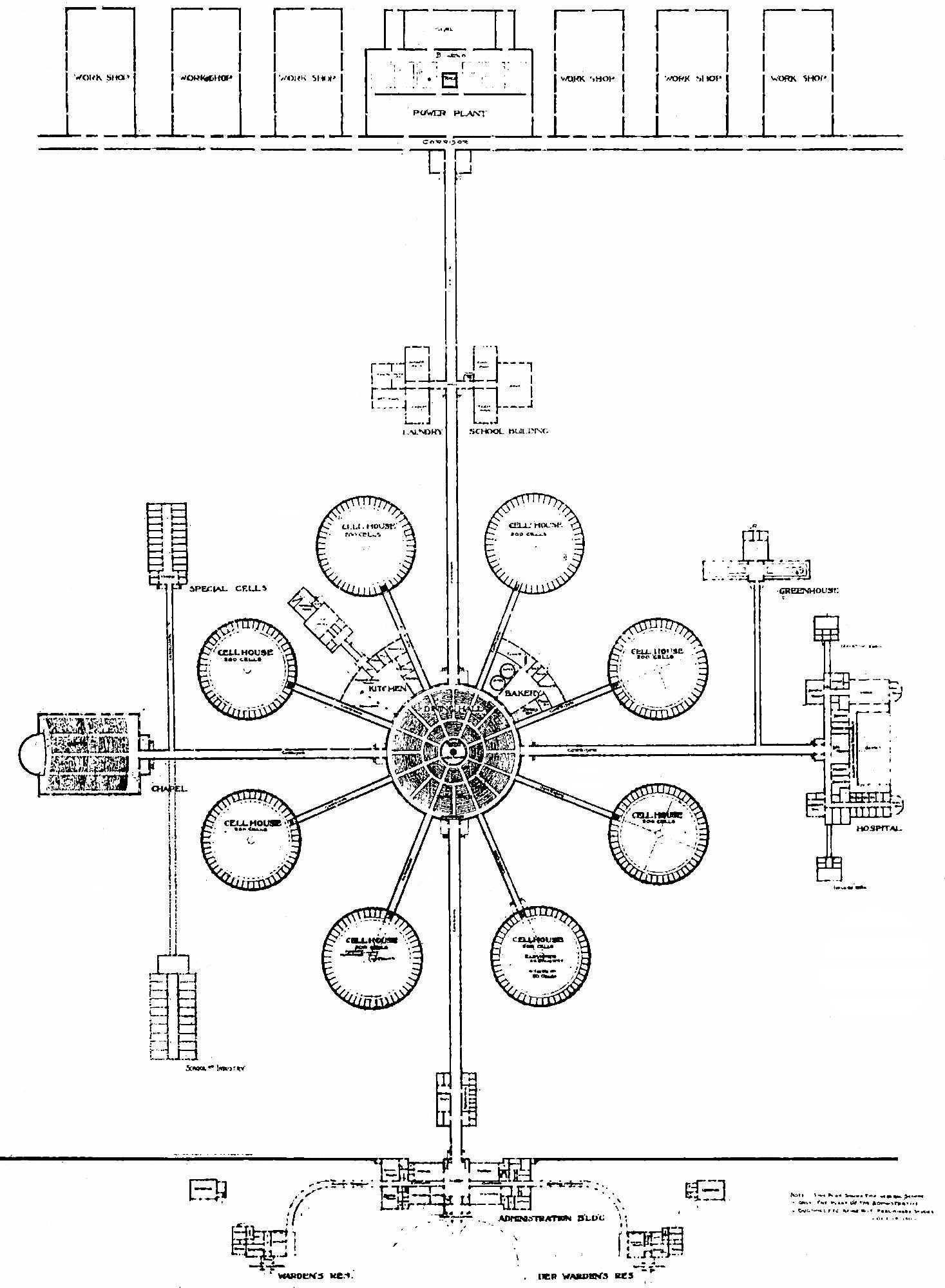 Another novel feature is the possibility of classification of prisoners in different groups. Easily moving partitions will be erected as high as the upper tier of rooms and placed with sufficient frequency so that no prisoner can see from his cell into that of any other cell, an arrangement which does not interfere with the view of the guard in the “conning tower” into any room of the cell house.