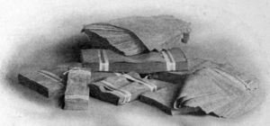 Broad sheets are placed in a baling box to form the bottom of the bale, and above them are laid smaller pieces, which are covered in turn with larger sections; then the whole mass is subjected to pressure to render it compact, afterward being bound up securely with steel hoops or wire.[Pg 23]