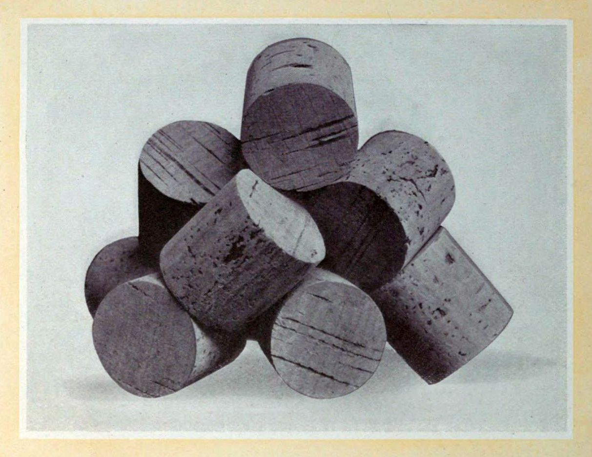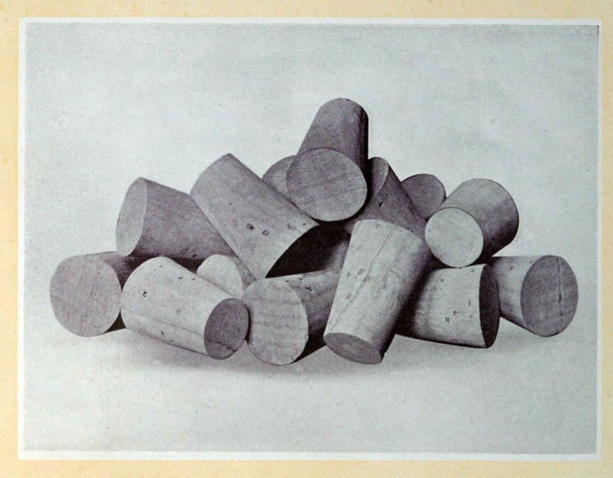 An order for a quantity of corks of a certain size and quality also involves, of necessity, the manufacture of a great many corks of other grades. The reason for this is, of course, found in the fact that the raw material, no matter how carefully sorted at the outset, will not produce a finished product of uniform quality. Thus frequently it becomes necessary to work over a given lot of corks for which there is no demand into a smaller size for which orders are pouring in.