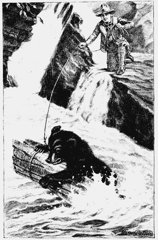 At that climactic moment, something solid went floating by his right fore paw, and[Pg 7] with all his feeble might he grabbed for it. It was a branch the Ranger had thrown in after him, and the branch was tied to a rope.