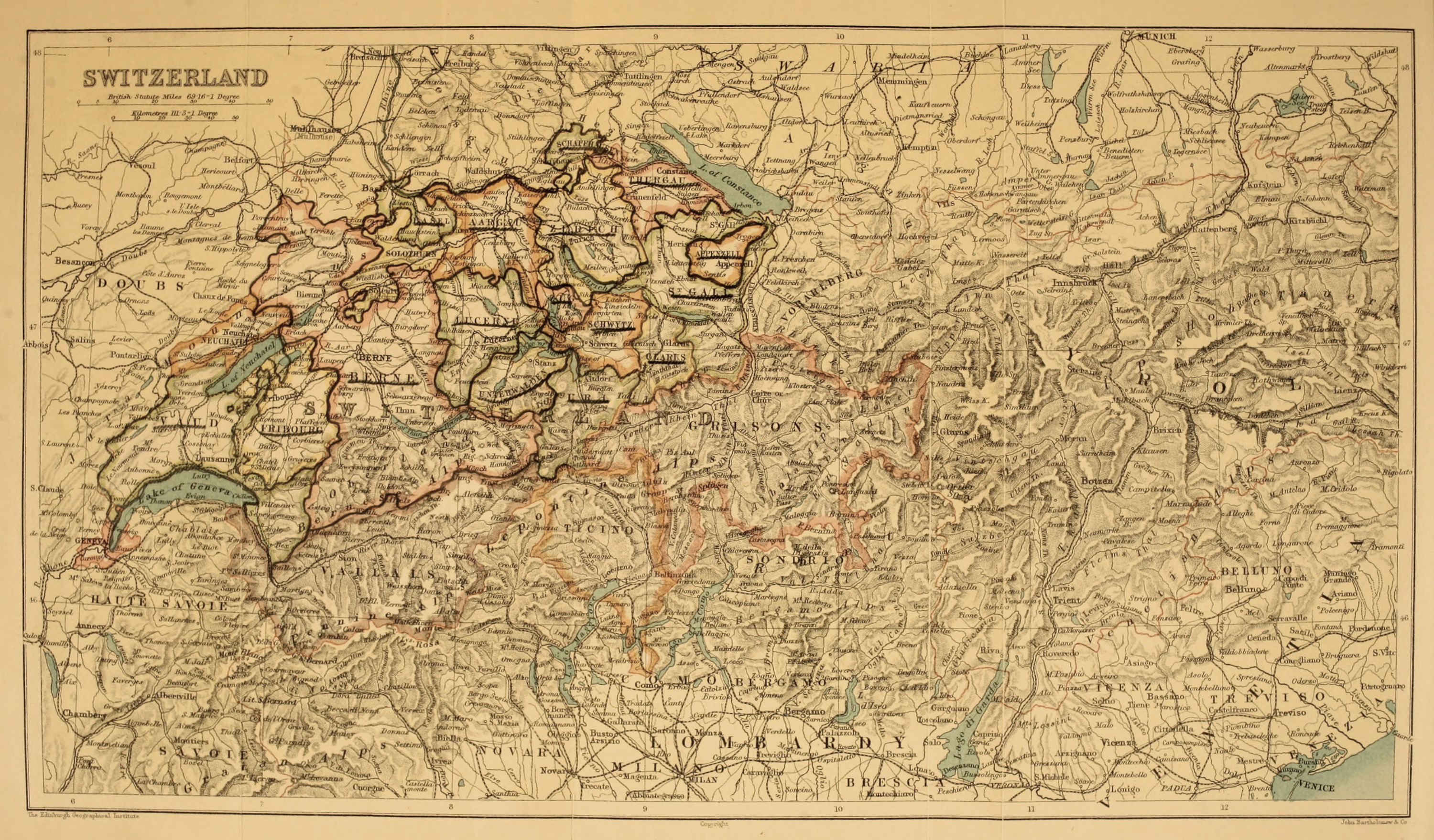 The German, Burgundian, and Italian nations which joined together to form the modern Swiss nation, cast away their original nationality, and made for themselves a new one, forming a nation as real and true as if it had strictly answered to some linguistic or ethnological division. These northern and southern nations of Europe have been singularly intermingled in Switzerland, and in this respect furnish an interesting study, as a striking exception to the general idea suggested by the word “nation” as a considerable continuous part of the earth’s surface, where speakers of a single tongue are united under a single government. The long persistent division of the Swiss people into German, French, and Italian stands in marked contrast with the thorough unity of the nation. They have never been blended into one people, so far as speaking a common language is concerned. German, French, Italian, Romansch, and Ladin are spoken within the limits of the Confederacy. And even the dialects of the German differ so much as to make communication almost impossible, at times, between the different villages and towns.