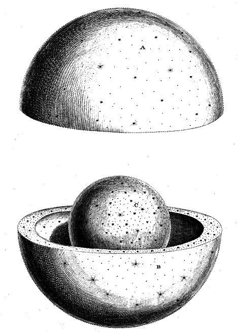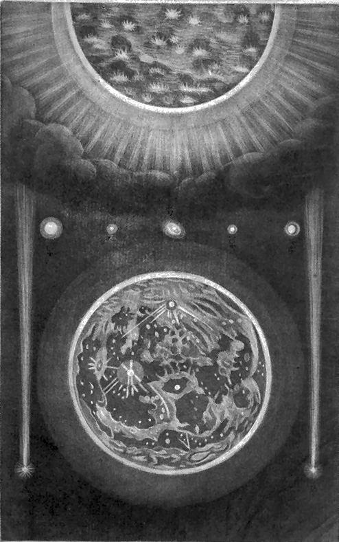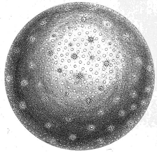 But what this central Body really is, I shall not here presume to say, yet I can't help observing it must of Necessity, if the Creation is real and not merely Ideal, be either a Globe of Fire superior to the Sun, or otherwise a vast terraqueous or terrestrial Sphere, surrounded with an Æther like our Earth, but more refined, transparent and serene. Which of these is most probable, I shall leave undetermined, and must acknowledge at the same time, my Notions here are so imperfect, I hardly dare conjecture. 'Tis true, I have ventur'd to think it may be one of these, and since so glorious a Situation can hardly be supposed without its proper Inhabitants, 'tis most natural to conclude it may be the latter. In the first Case, besides our having no Idea of Beings existing in Fire, it would not, notwithstanding its Distance, be so easy to account for its being invisible; and since the Lustre of the Stars are all innate, they could receive no Benefit from it, and consequently such a Nature as a solar Composition, must in this Place be render'd useless; but in the latter Supposition - 80 - of its being a dark Body, we have no Difficulty attending us, having several Instances of like Bodies, moving round an opaque one. Now when we consider, that all those radient Globes, which adorn the Skies, those bright ætherial Sparks of elemental Fire, thick strewed like Seeds of Light all round our Hemisphere, are each to us the Embrio of a glorious Sun; how awful and stupendious must that Region be, where all their Beams unite and make one inconceivable eternal Day?