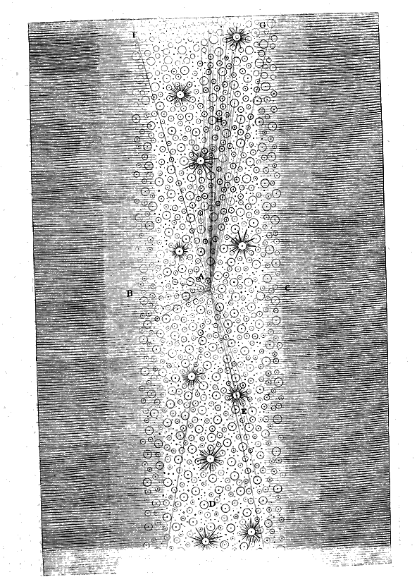 That this in all Probability may be the real Case, is in some Degree made evident by the many cloudy Spots, just perceivable by us, as far without our starry Regions, in which tho' visibly luminous Spaces, no one Star or particular constituent Body can possibly be distinguished; those in - 84 - all likelihood may be external Creation, bordering upon the known one, too remote for even our Telescopes to reach.