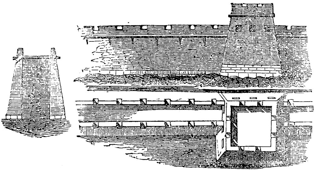 This is an engraving of a small portion of this wonderful work. At the top is represented a piece of the wall, with one of the towers, as it is seen by a person standing on the ground. Immediately under it is a bird’s-eye view of the same, representing the dimensions and position of the tower, in relation to the wall. And on the left side is a section which shows how the masonry is constructed—of two walls getting thinner towards the top, and the intermediate space filled in with work of a rougher kind.
