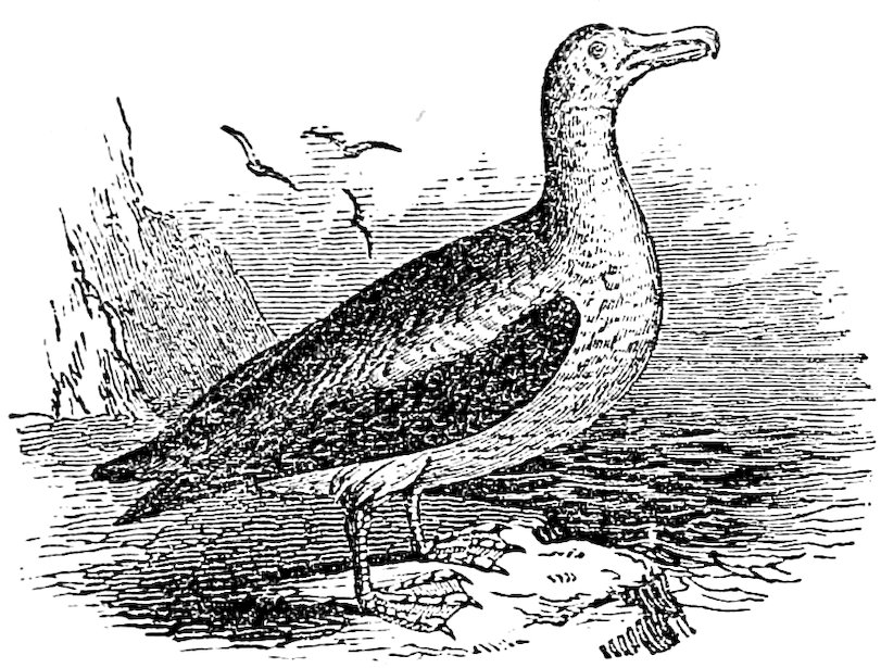 Wednesday, July 1. We caught to-day, with a hook, one of the sailor’s sea-hens. It proved to be the brown albatros of the Pacific; and measured ten feet between the tips of its wings. When brought on board, the fellow threw his wild glances at the crew, and walked about as haughtily as if sole monarch of the peopled deck. One of the men attempted to trifle with his dignity, when he pounced upon him and severely chastised his impertinence. After being detained an hour, we let him go to join his female companion, who was waiting for him, on the wave, by the side of the ship. The albatros never deserts its consort in calamity.