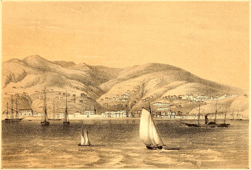 The bay of San Francisco resembles a broad inland lake, communicating by a narrow channel with the ocean. This channel, as the tradition of the aborigines runs, was opened by an earthquake which a few centuries since convulsed the continent. The town is built on the south bend of the bay, near its communication with the sea. Its site is a succession of barren sand-hills, tumbled up into every variety of shape. No levelling process, on a scale of any magnitude, has been attempted. The buildings roll up and over these sand ridges like a shoal of porpoises over the swell of a wave, only the fish has much the most order in the disposal of his head and tail. More incongruous combinations in architecture never danced in the dreams of men. Brick warehouses, wooden shanties, sheet-iron huts, and shaking tents, are blended in admirable confusion.
