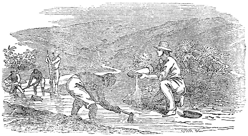But these grotesque habitations have as much uniformity and sobriety as the habits of those who occupy them. Hazards are made in commercial transactions 396and projects of speculation, that would throw Wall-street into spasms. I have seen merchants purchase cargoes without having even glanced into the invoice. The conditions of the sale were a hundred per cent. profits to the owner, and costs. In one cargo, when tumbled out, were found twenty thousand dollars in the single article of red cotton handkerchiefs! “I’ll get rid of those among the wild Indians,” said the purchaser, with a shrug of his shoulders. “I’ve a water-lot which I will sell,” cries another. “Which way does it stretch?” inquire half a a dozen. “Right under that craft there,” is the reply. “And what do you ask for it?” “Fifteen thousand dollars.” “I’ll take it.” “Then down with your dust.” So the water-lot, which mortal eyes never yet beheld, changes its owners without changing its fish. “I have two shares in a gold mine,” cries another. “Where are they?” inquire the crowd. “Under the south branch of the Yuba river, which we have almost turned,” is the reply. “And what will you take?” “Fifteen thousand dollars.” “I’ll give ten.” “Take them, stranger.” So the two shares of a possibility of gold under a branch of the Yuba, where the water still rolls rapid and deep, are sold for ten thousand dollars paid down! Is there any thing in the Arabian Nights that surpasses this?