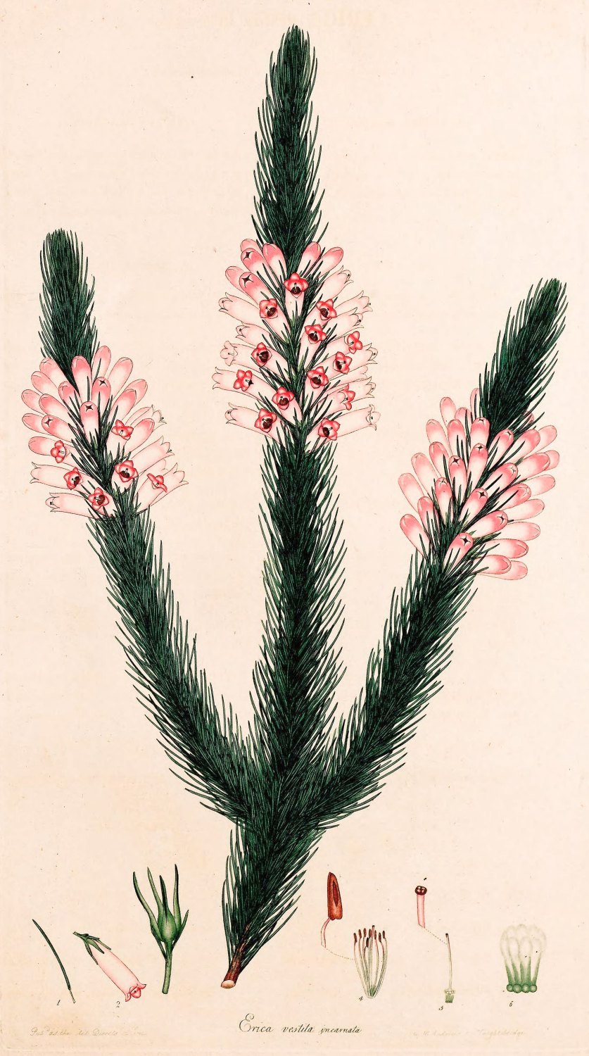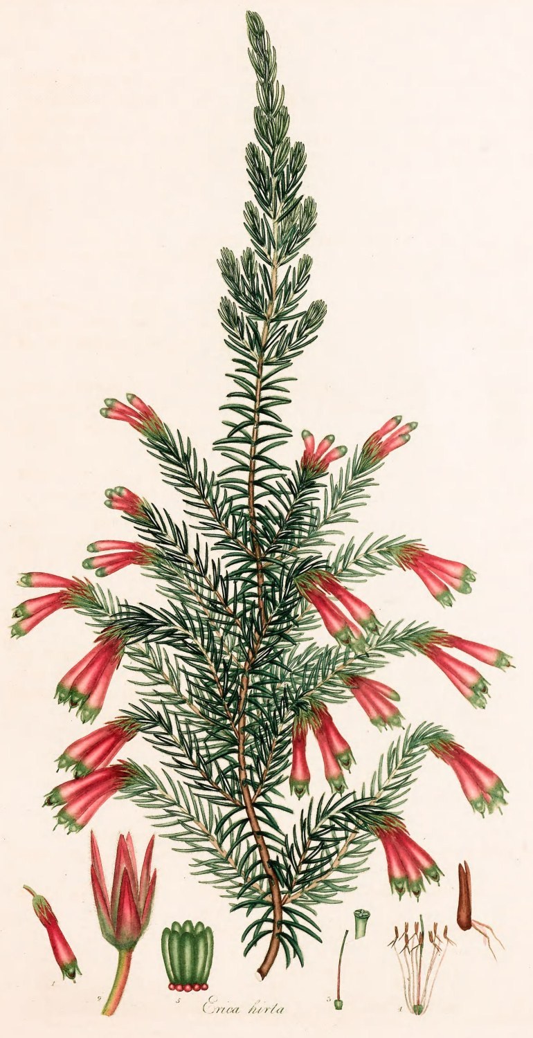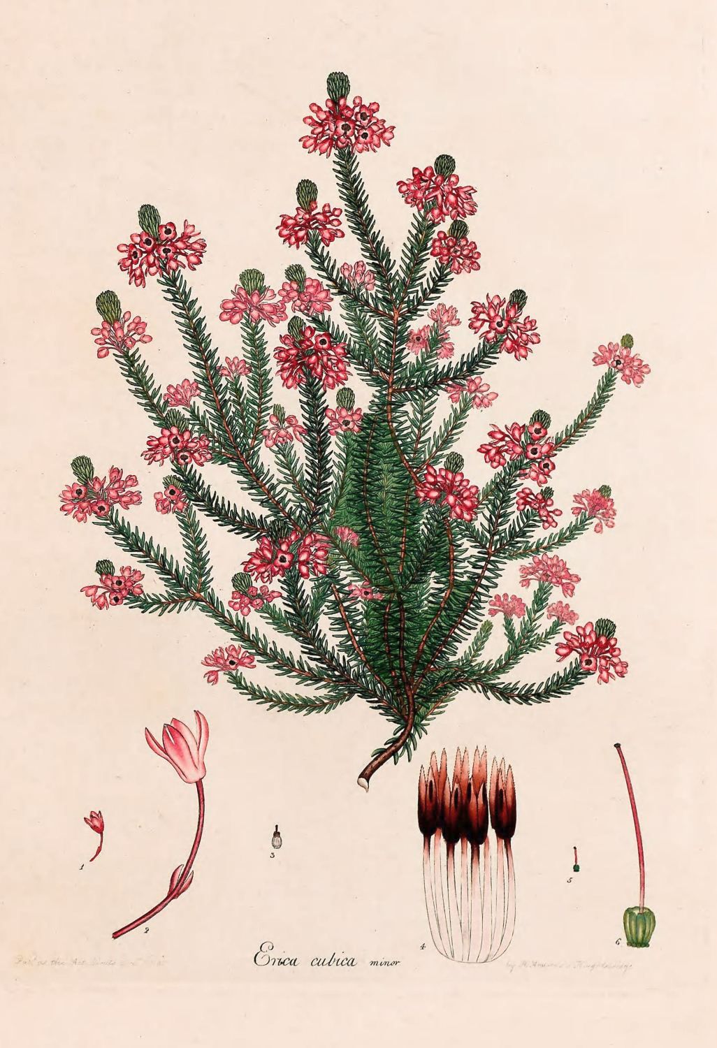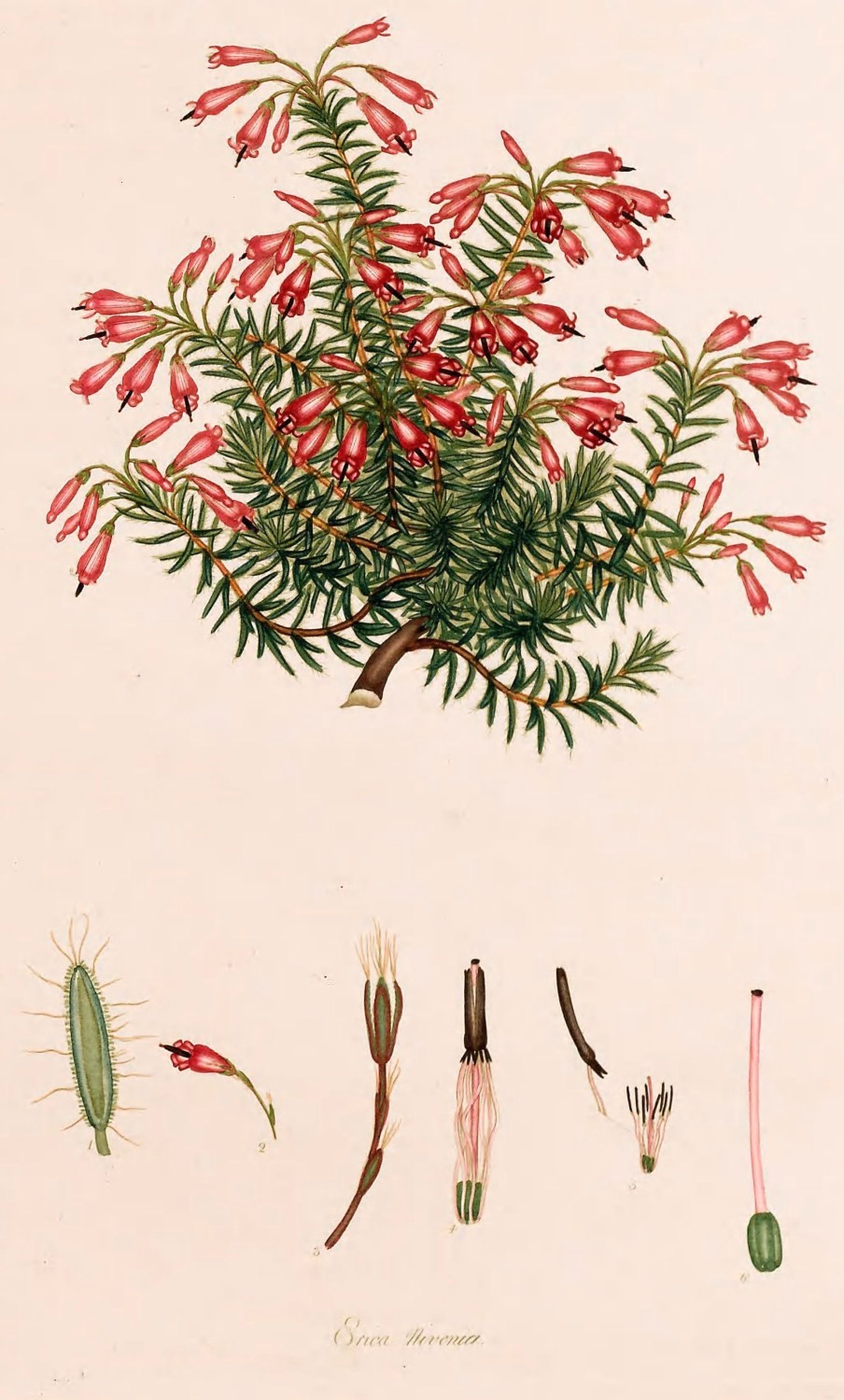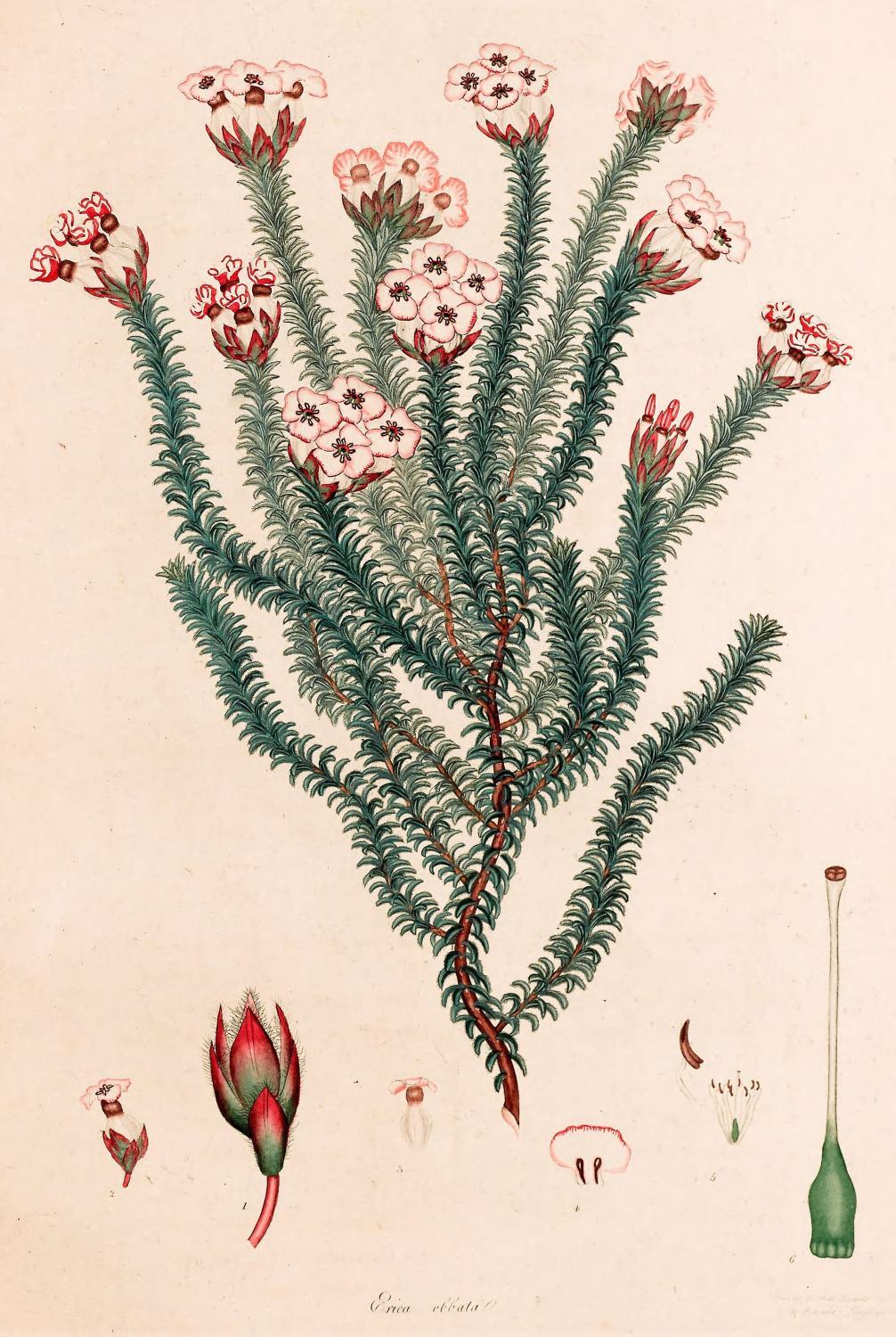 THE unabating ardour that still prevails in the science of botany, and rather increases than diminishes, renders it almost impossible (from the extreme minutiæ annexed to this elegant tribe) for the pencil of the artist to keep pace with the numerous importations from the Cape (at present the sole emporium of the genus Erica); the limits of the genus it is impossible at present to prescribe, but by the termination of the next volume we have no doubt of being able to ascertain, in some measure, its extent. The author’s intention is therefore to figure (first) all the most elegant and desirable of the genus, including many very beautiful varieties, of recent introduction, that far surpass those from which they derive their name; reserving, as a dernier ressort, the most uninteresting and least attractive, to subjoin at the termination of the genus, as necessary links in the chain of this extensive family. The great difficulty attending the cultivation of many of the species, so generally complained of, can only be surmounted by great care and attention to keep them from the partial damps and fogs so prevalent in this island. Among the most tender and difficult to preserve, and which require the most care, are the E. obbata, E. retorta, E. ampullacea, E. Aitonia, E. Jasminiflora, E. vestita alba, and E. Massonia; the last of which is perhaps the most tender, owing most likely to the closeness of the leaves, joined with the soft hairs that surround them, which is a great encourager of secreted damps: this, assisted by the great succulence that pervades the upper part of the plant, and its rather abrupt commencement from the wood, renders it so difficult to be preserved. They should by no means be intermixed with other plants, but kept in a house entirely appropriated to them, and so arranged that the air may have as free an egress and regress as possible to them all; as undoubtedly the mixing of them with plants whose foliage is so much larger, although it may produce a pleasing contrast, must exclude the free approach of the atmosphere, to which they are so much exposed in their native clime, and to which the nearest approximation [Pg 8][Pg 7][Pg 6]must certainly be most congenial.