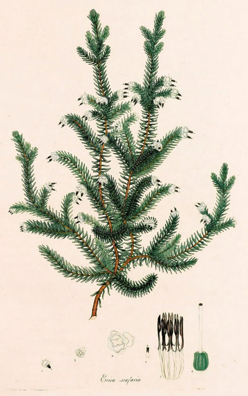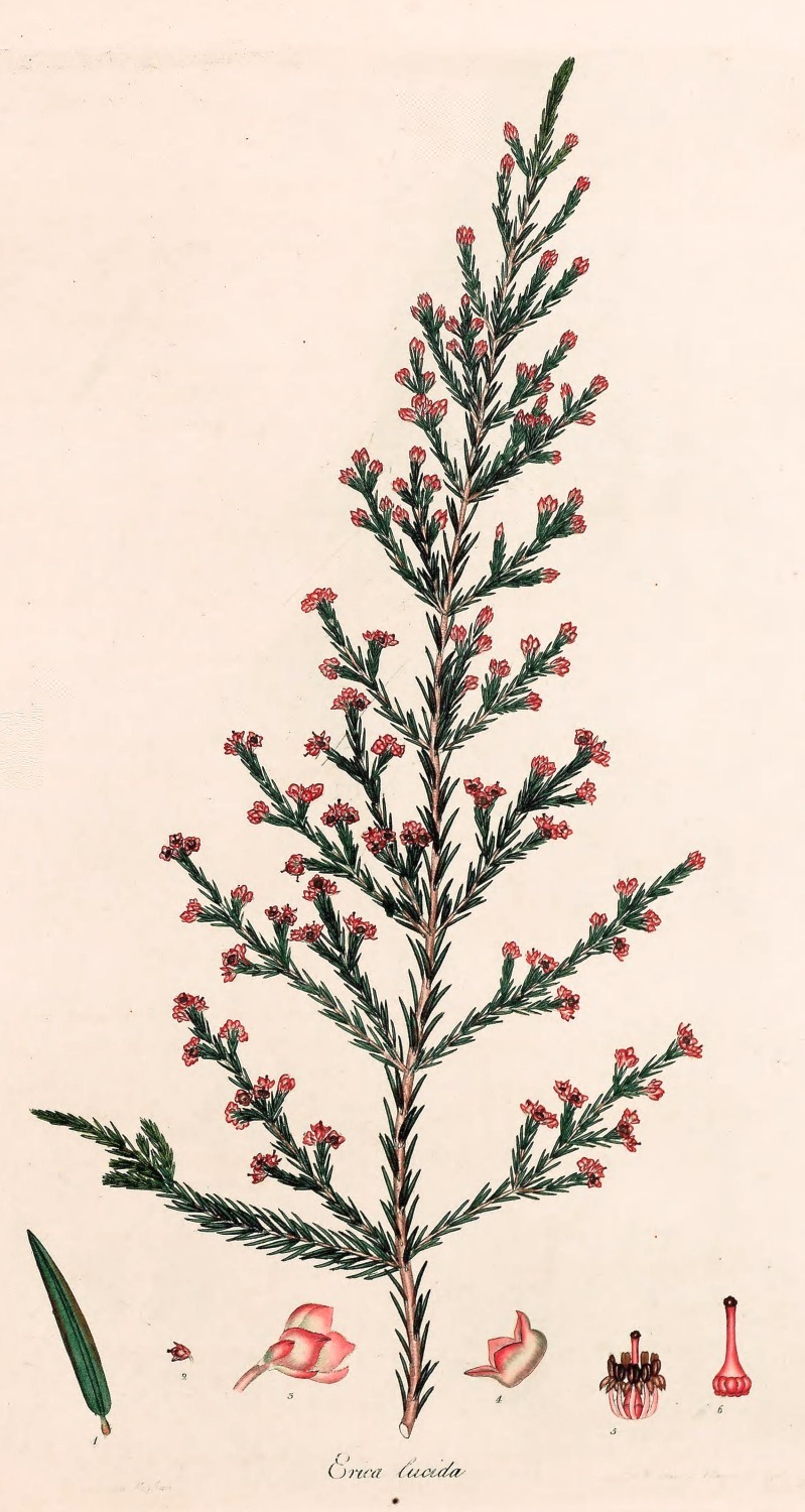Heath with beardless tips, within the blossom, shaft without; flowers nearly terminate the branches in whorls; blossoms tubularly club-shaped, hairy, of a red-purple colour, and an inch long; leaves grow by sixes, harsh, and sawed at the edge as if fringed.