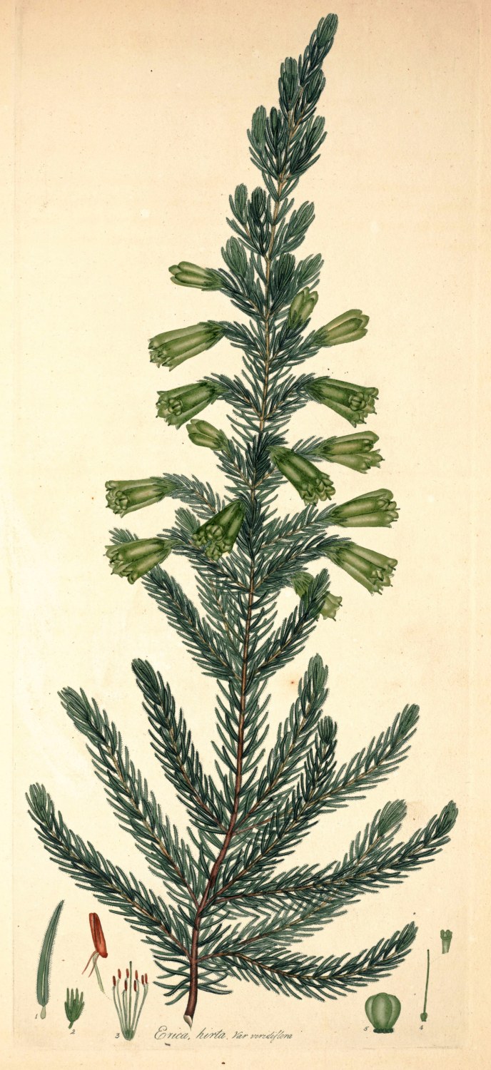 Heath, with beardless tips, without the blossom. Flowers hairy, pitcher-shaped, and white. Cup hairy, with green edges. Leaves by threes, rolled back at the edges, and hairy. Stem weak.