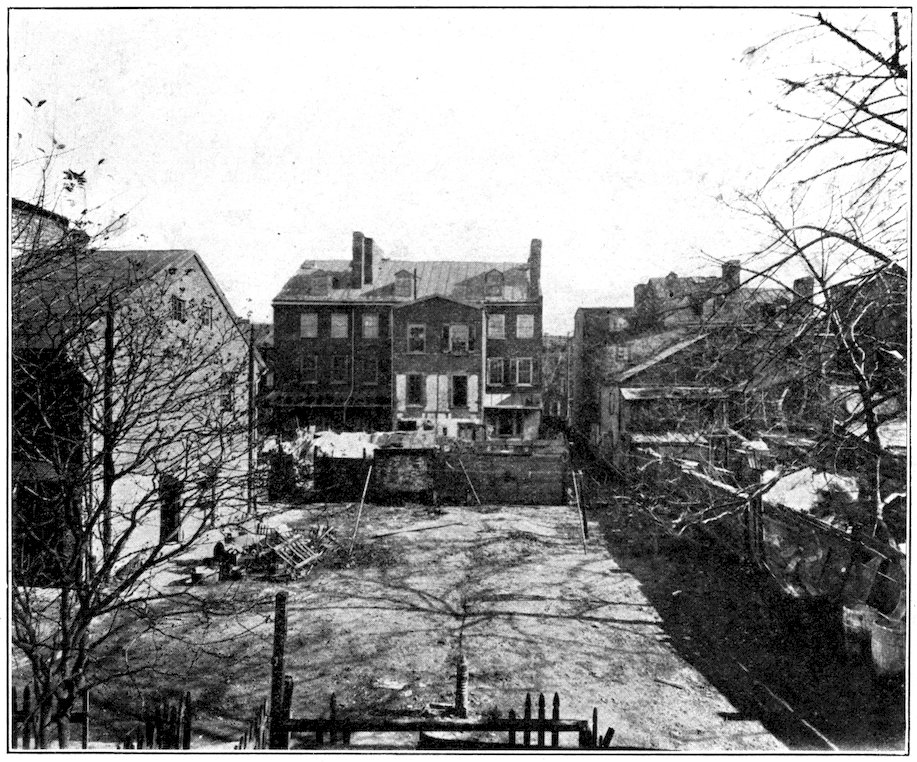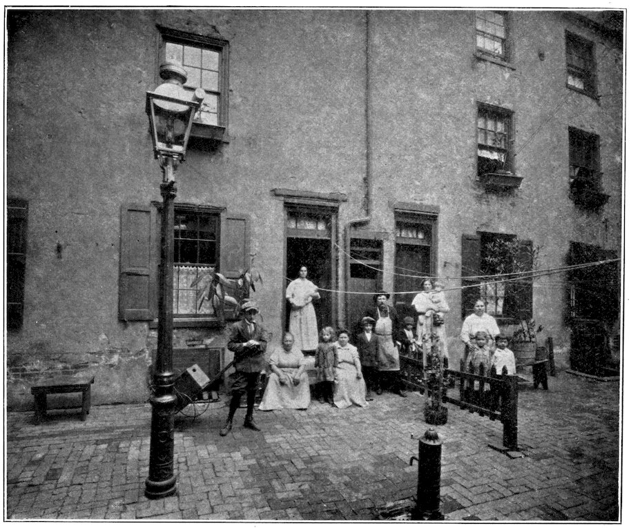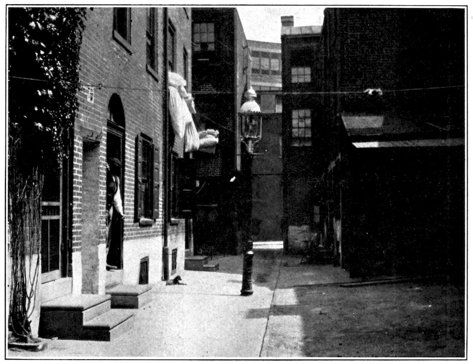 There are tenements, of recent origin: there is in prospect a tenement problem. But the satisfaction of the developed instinct of the home-builders and housekeepers of Philadelphia does not lie in the direction of the sky-scraping multiple dwelling, which replaces a front porch with a fire-escape, makes a box of geraniums or a rubber-plant do duty for a garden, festoons the vista between towering walls with “the short and simple flannels of the poor,” and suspends the growing child like Mahomet’s coffin half-way between a clouded heaven of grimy skylight or gravelled roof and the cluttered inferno of the pavement far below.