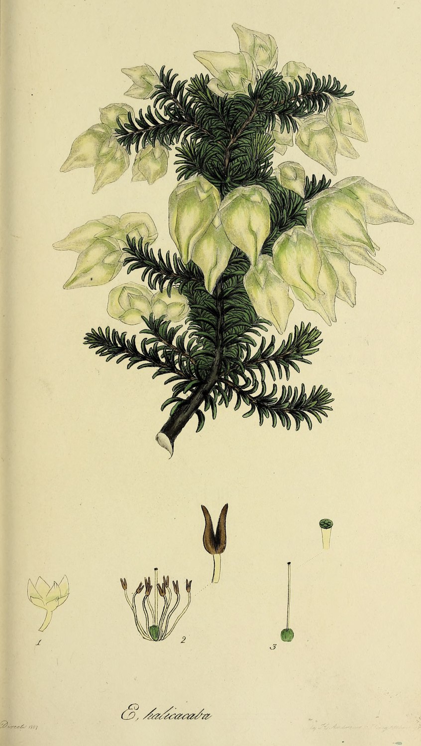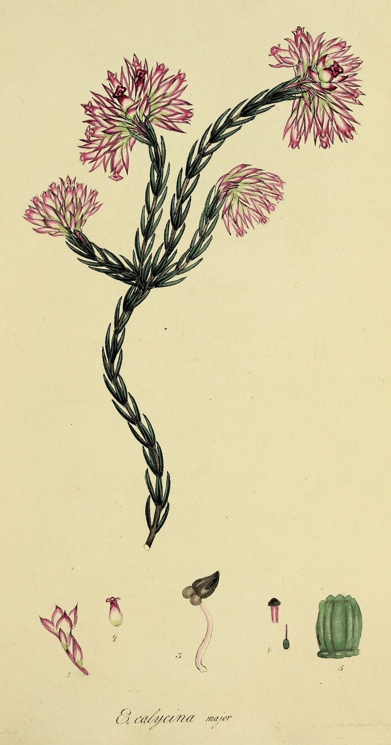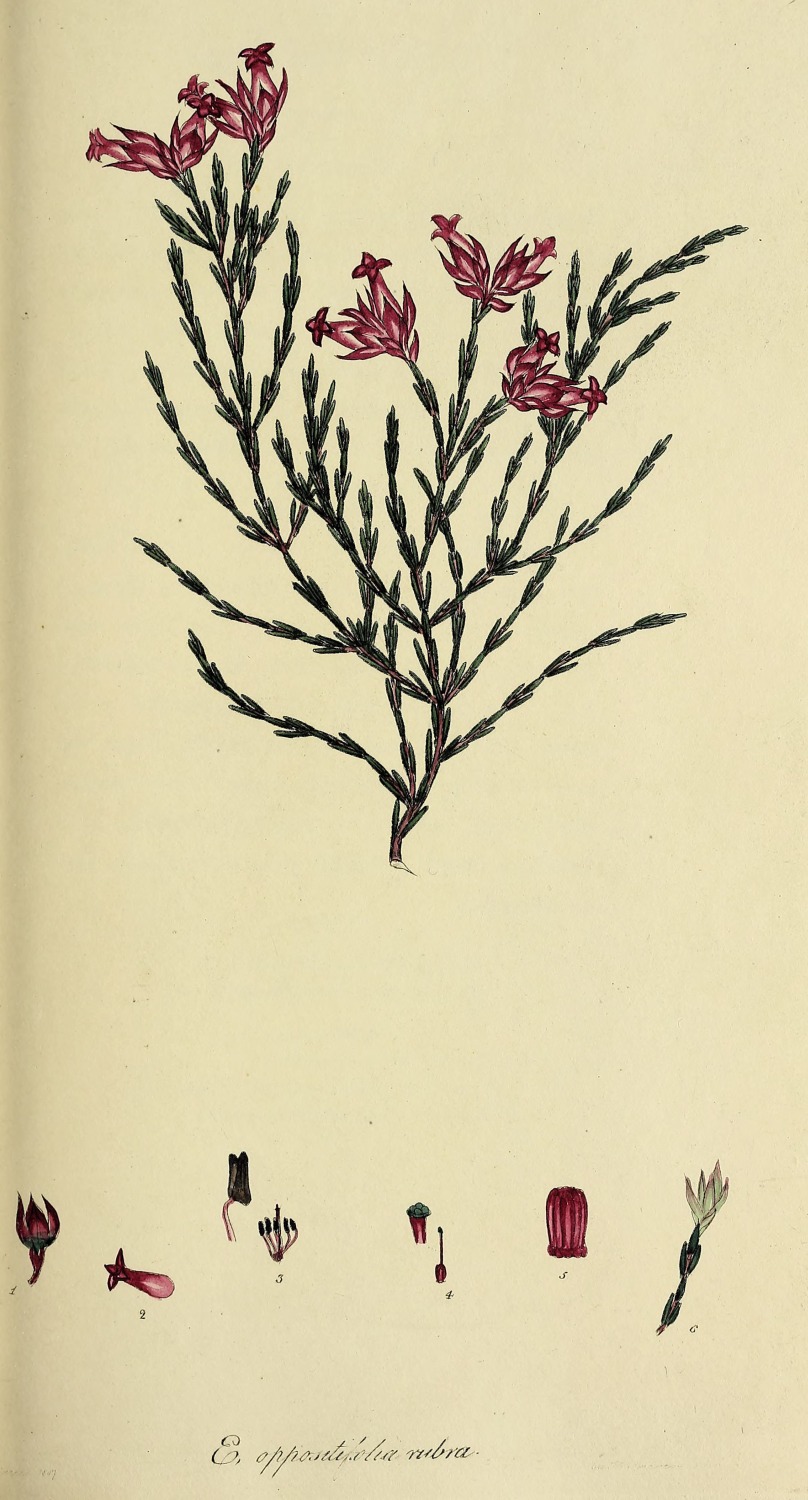 Tips crested, and within the blossom. Flowers terminate the smaller branches in umbels. Footstalks flesh-coloured. Cup four-leaved. Leaflets spathula-shaped, sharp-pointed, flesh-coloured, greenish at the base, and longer than the flower. Blossom pitcher-shaped, of a deep flesh-colour, pale at the base: segments of the border spreading, and sharp-pointed. Leaves by threes, lance-shaped, three-sided, sharp-pointed, and pressed to the branches. Stem twiggy, a foot high. The small and large branches are very flexuose.