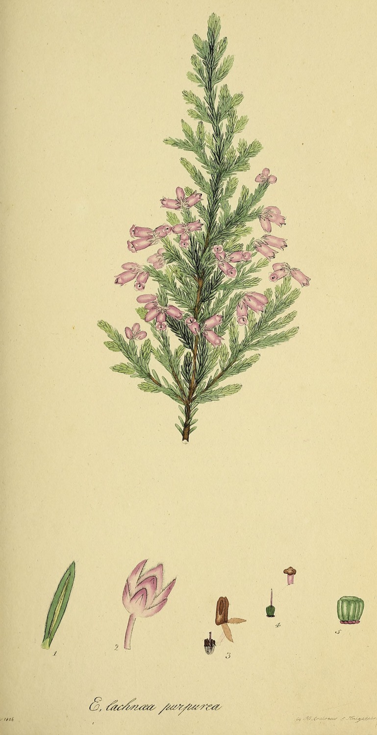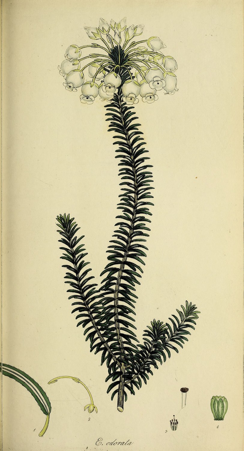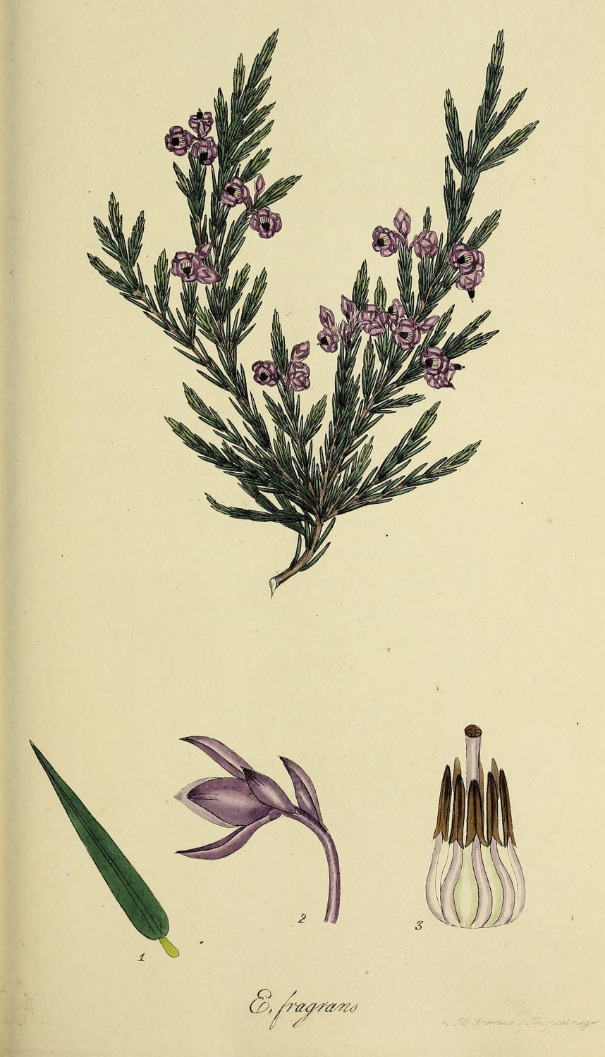 Tips two-horned at the base, and without the blossom. Flowers grow mostly by threes, lateral, and terminal, small, and with longish peduncles. Blossom bell-shaped, sweet-scented, pale purple, with largish revolute segments. Leaves in threes, awl-shaped, upright, of a glaucous green, and sharp-pointed, flat on their upper surface, and furrowed beneath. Stem shrubby, half a foot high, very much branched, with the branches spreading.