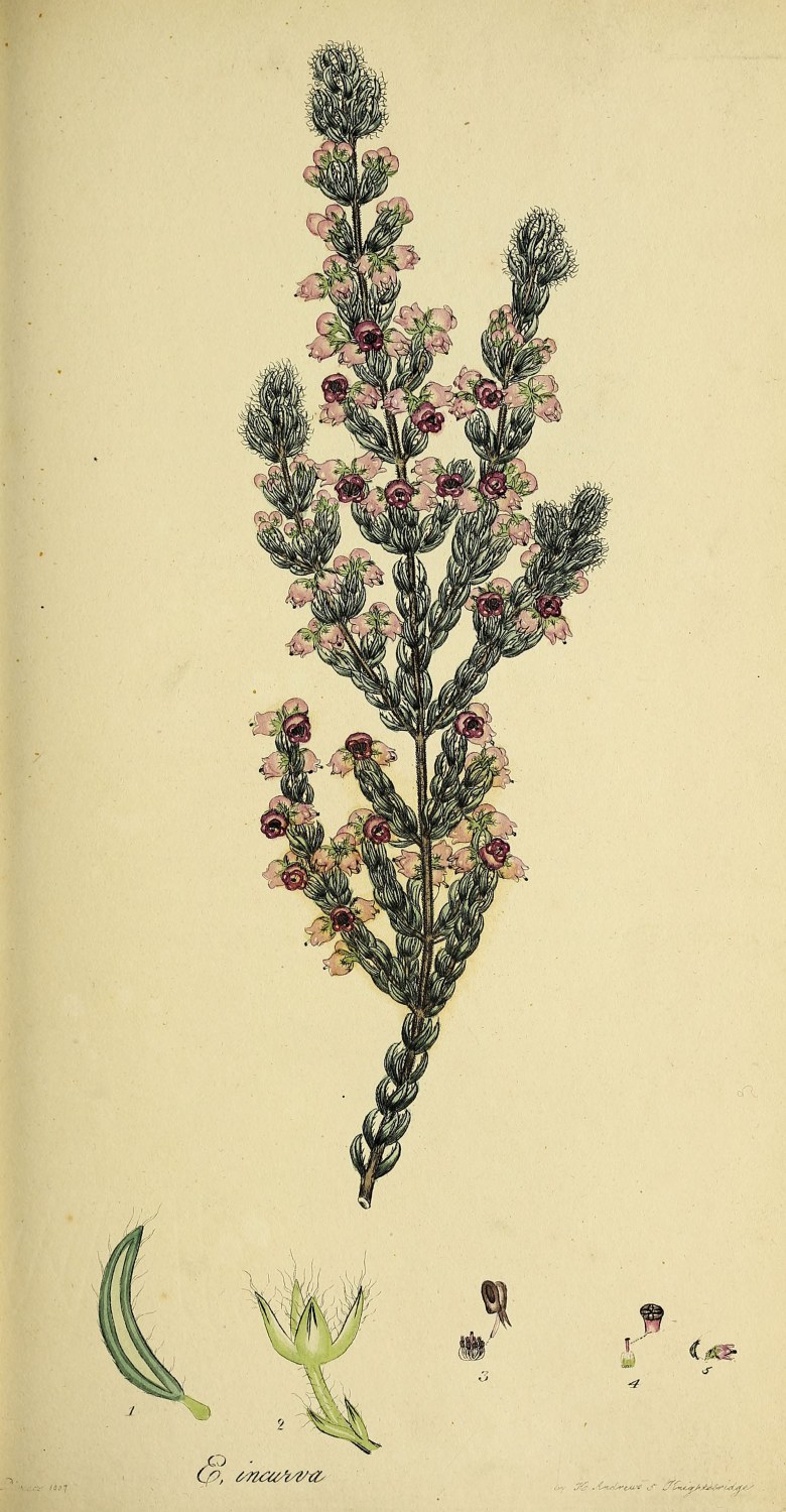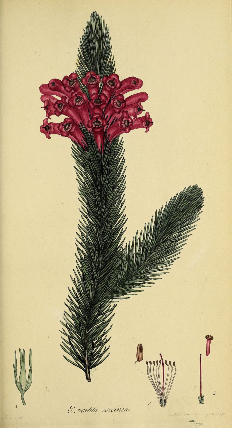 Tips beardless, without the blossom, and very long. Flowers grow by threes at the ends of the small branches, hanging down, with very short footstalks. Blossom club-shaped, turned inwards, of a deep scarlet colour, and furrowed. The segments of the mouth are blunt, and turned inwards. Leaves by threes, linear, curved, crowded, reflexed, and sharp-pointed. Stem upright, two feet high. The larger branches few, covered with small branches crowded together.