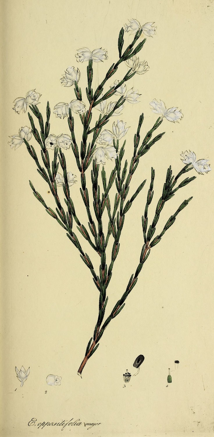 Tips crested, and just within the blossom. The flowers grow at the ends of the smaller branches, forming a close bunch. Footstalks are long, and purple. Blossom nearly egg-shaped, bending down, and flesh-coloured; the mouth contracted, and slightly cut into four upright segments. Leaves by fours, obtuse, linear, and smooth. Stem nearly upright, a foot high, and very much branched; the large and smaller branches are flexuose, and spread outwards.