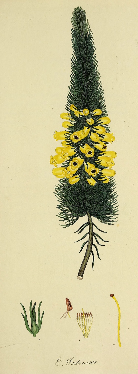 Tips beardless, just within the blossom. Flowers grow horizontally in whorls near the summit of the branches. Footstalks very short, and furnished with three floral leaves. Blossom cylinder-shaped, smooth, and of a gold colour: segments of the mouth a little reflexed. Leaves by sixes, linear, and smooth, turned inward at the point, and spreading. Stem upright, shrubby, a foot high. The branches grow in whorls, and are spreading.