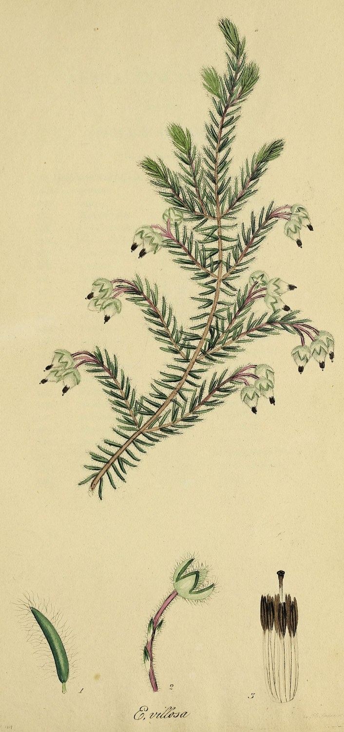 Tips beardless, and without the blossom. Flowers grow at the extremity of the smaller branches, mostly by threes, hanging down. The footstalks are long, and of a red colour. Cup broadly egg-shaped; the edges of the cup are of a bright green colour. Blossom pitcher-shaped, villous, and white; the segments of the border are obtuse, and upright. Leaves by threes, linear, and blunt; the edges rough, with long hairs. Stem shrubby, flexuose, and of a purplish colour. The small and large branches are thread-shaped, and hairy.