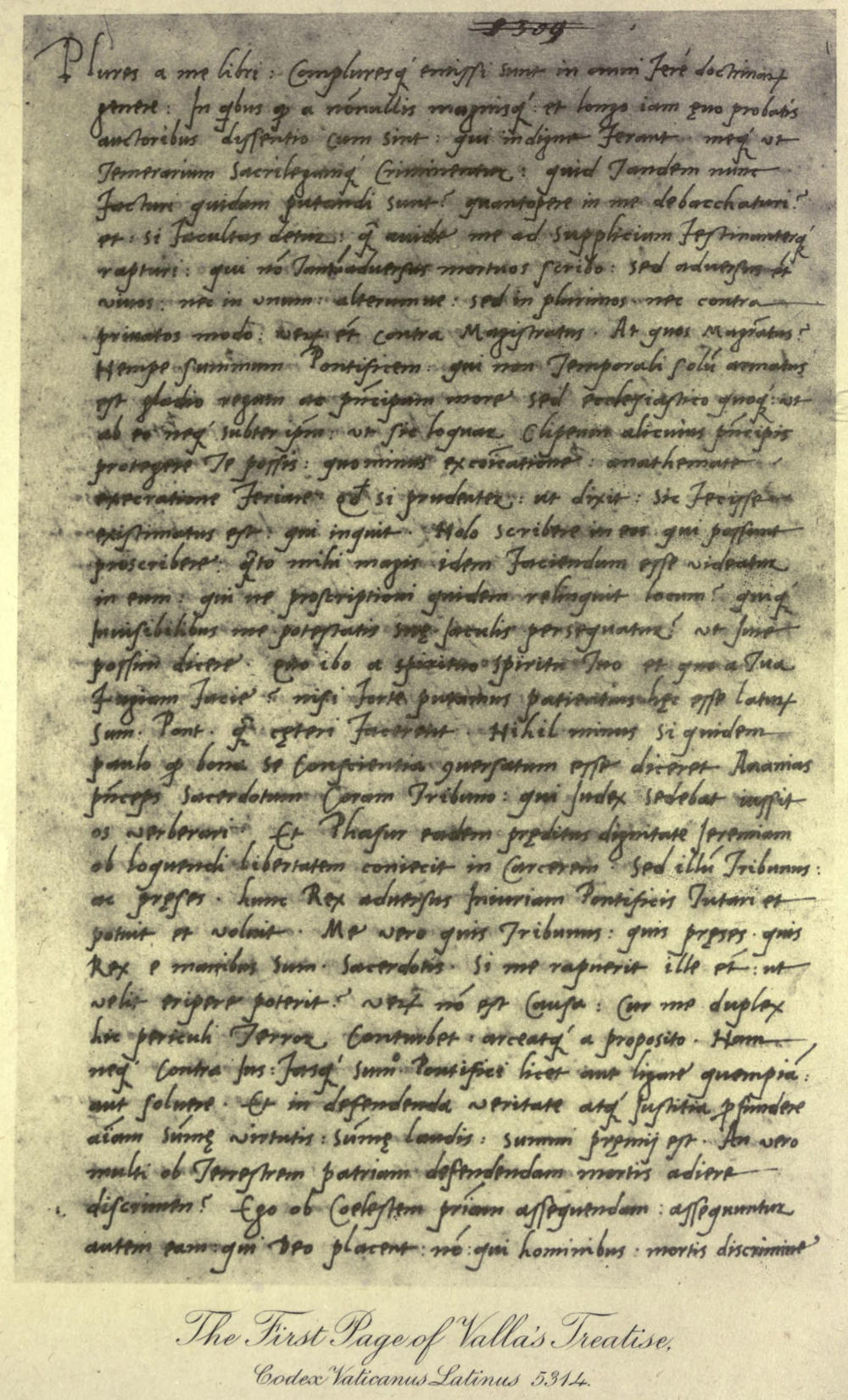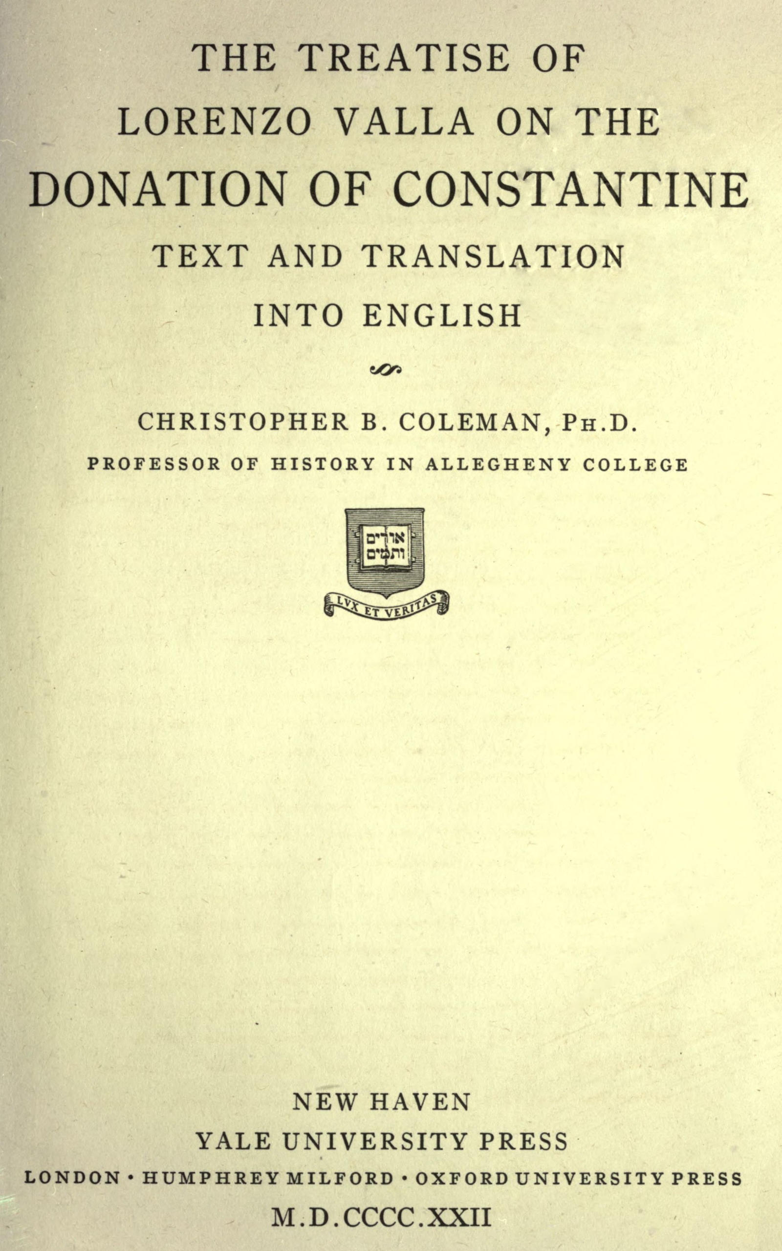 The question of the position of the bishop of Rome in the Christian Church lacks but a few generations of being as old as Christianity itself. His relation to secular governments became an acute problem as soon as the imperial government broke down in Italy, and has remained so to the present moment. For centuries the Papacy was the strongest institution in western Europe. While its control at any one time rested principally on the power it actually possessed and on the ability of its representatives, legal theories and historical documents played a not inconsiderable part in its rise and decline. Of these documents the Donation of Constantine was perhaps the most spectacular, even though it was not the most important. It was cited by no less than ten Popes of whom we know, to mention no lesser writers, in contentions for the recognition of papal control, and contributed not a little to the prestige of the Papacy. On the other hand, when its spuriousness became known, the reaction against it, as in Luther’s case, contributed powerfully to the revolt from Rome. Its century-long influence entitles it to a respect difficult for any one who now reads it to feel. And Valla’s discussion of it contains many interesting reflections on the secular power of the Papacy, perhaps the most interesting expression in this connection of fifteenth century Italian humanism.