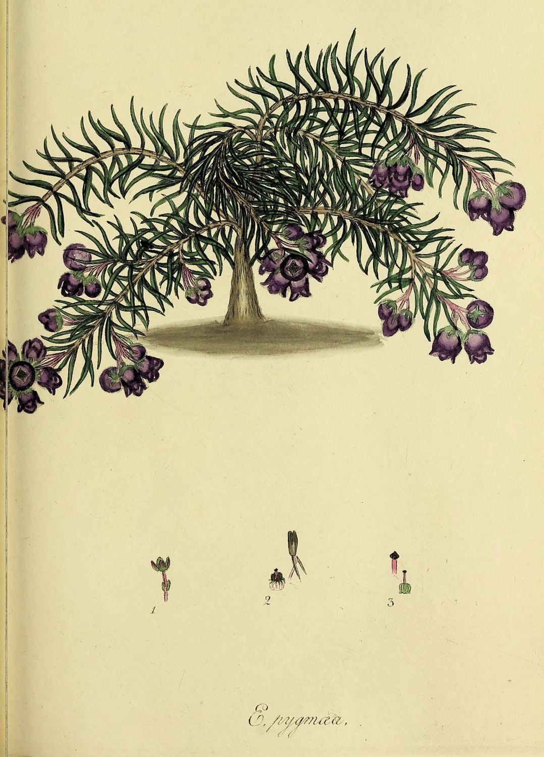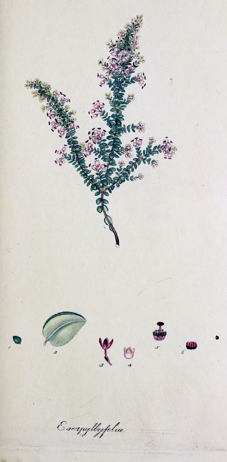 Tips beardless, within the blossom. Flowers grow near the summit of the branches in whorls, spreading out. Blossom purple, cylindrical, an inch long, and rather narrowed at the mouth: segments of the border heart-shaped, sharp pointed, and rolled back. Leaves by fours, three-sided, revolute, sharp-pointed, and shining, flat on the upper surface, and furrowed beneath. Stem shrubby, a foot high, branching. Branches flexuose, and thread-shaped.