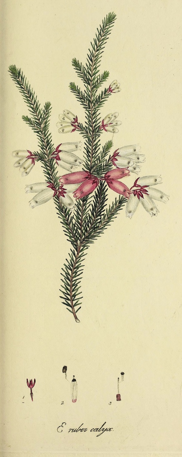 Heath with beardless tips, within the blossom. Flowers terminate the branches in crowded heads. Blossom pitcher-shaped and flesh-coloured. The cup is large and coloured. Footstalks very short. Leaves by threes, awl-shaped, smooth, and pressed to the branches. A dwarf shrub with a stout stem, the large and smaller branches thread shaped and flexuose.