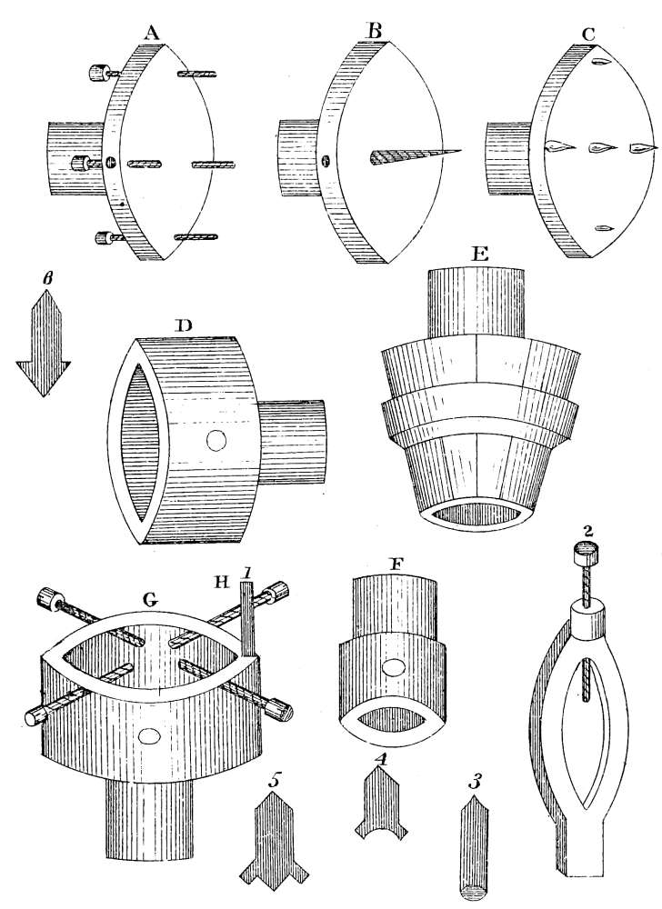 In turning the pillars in the temple, pl. 13, great inconvenience and trouble have been found in working them, for want of the support of the puppet G, plate I; for as in each step the eccentric chuck has to be slightly altered, the point, J, of the puppet, when the work is moved, is apt to slide back into the hole it first formed, thus making the steps quite crooked. To obviate this difficulty, I should advise my readers to use the following simple contrivance.[Pg 134] Take out the point, J, and replace it by a piece of wood turned to fit exactly into the tube, and on the end of which is left a circular piece the size of a half-crown. Take another bit of wood, of the diameter of your pillar; fix a short nail into the middle of it; glue the other side to the pillar, put it on the lathe, screw up the puppet, G, and you will find the nail will always, whenever you move the chuck, firmly fix itself into the wooden end which replaces the point J.