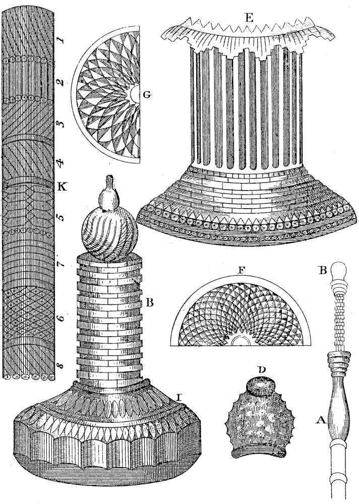 The stopper of the bottle, B, is also ornamented with this cutter, and with an angular tool. First turn the stopper quite circular, (the knob at the top must be glued in afterwards). Set the sliding rest at a convenient distance, and place under it one of the slide-rest tools, so as to raise it in an uneven manner; screw the rest firmly, and set the circle just large enough to encircle half the stopper. By[Pg 93] this means the tool cuts the UNDER part of the circle, and passes over the other half: this pattern must be cut very deep, and about five numbers be counted between each cut on the brass wheel of the lathe.