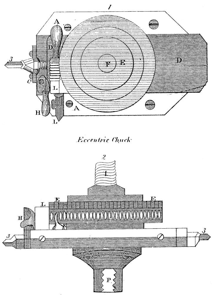 Perhaps the most useful of all the additions to the lathe is this chuck, for by its aid the turner can alter the centre of his work as he pleases, producing a great variety of circular lines of different sizes, and other ornaments, which cannot be attempted without it. The tools are those already described belonging to the slide rest, which latter, when used with this chuck, assumes quite a different character than when employed with the eccentric and universal cutters and the drill. With these three, it merely serves to mark, by aid of its screw, the distance they require to be from the work, and the position in which they are to be placed, but does not assist in the size or form of the patterns to be cut; with the eccentric chuck, however, it is quite different. The rest marks the size of the circles, while the chuck fixes their position. Thus: suppose you wish to cut a circle, or series of circles, not as in the pattern, No. 1, plate 6, which begin from the centre and gradually enlarge, but like [Pg 95]those in No. 3; the slide rest must be set to the proper position, to enable the tool to cut the requisite circle, and then the chuck must be screwed down till the tool arrives opposite the exact place where the pattern is to be worked. With this chuck the over-head frame is no longer used; the brass and fly-wheels being employed together, as in common turning, the chuck having a wheel of its own by which to regulate the patterns. In the annexed plate, fig. 1, is a front view of the eccentric chuck; fig. 2 is the same seen sideways.