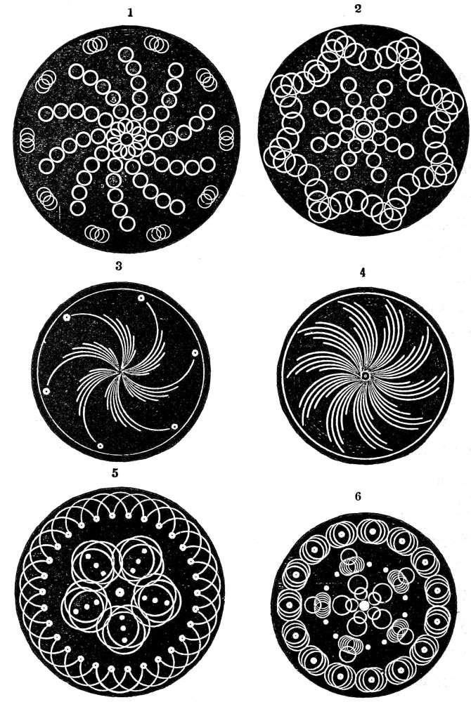 Count 40 on the eccentric chuck wheel for each of the three large circles, diminish one turn of the eccentric chuck. Then diminish the circle two turns of the rest screw, and lower the eccentric chuck two turns, and cut a circle every 20 numbers; the others are done the same. For the second pattern of circles, cut one for every number on the eccentric chuck wheel; then move one number on the eccentric chuck wheel, and move the eccentric chuck downwards one turn, and cut a circle every 15; by moving the chuck down, and advancing one number every time, the circles are made to incline sideways. The outer pattern is much the same as in the two former ones.