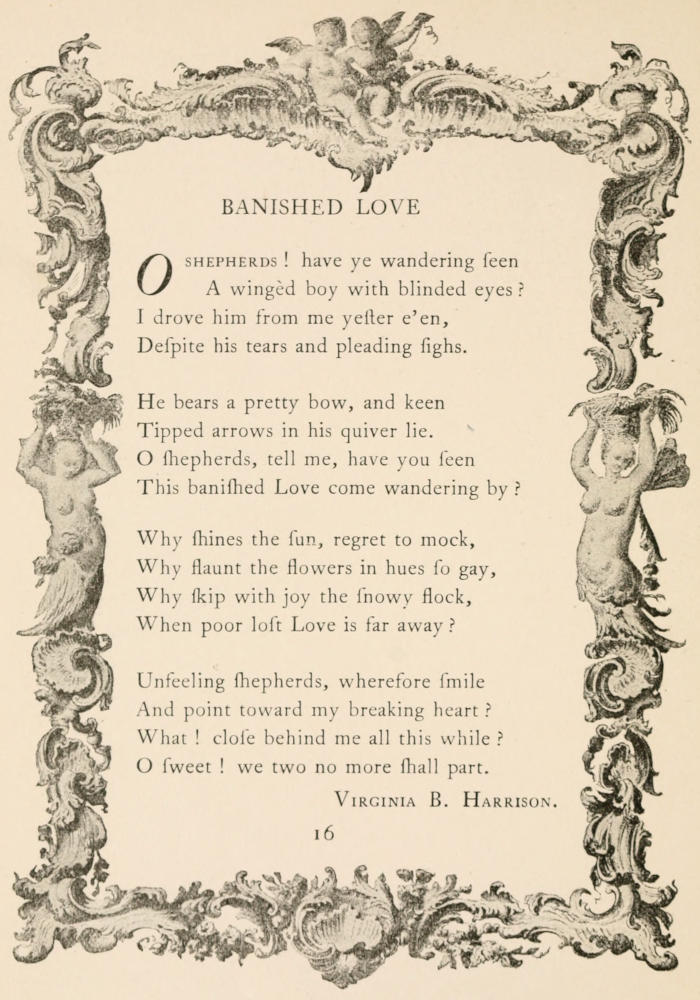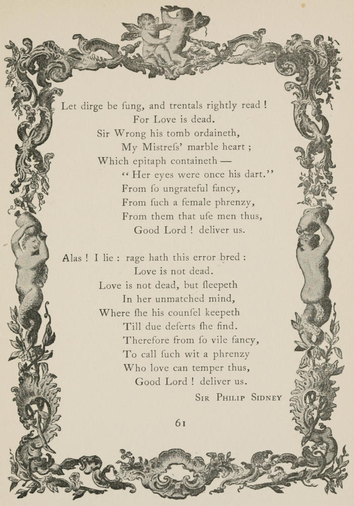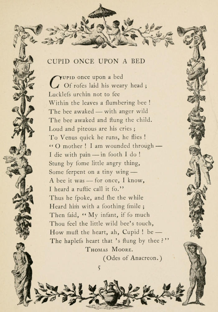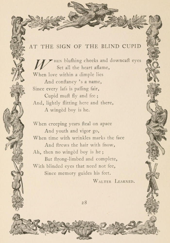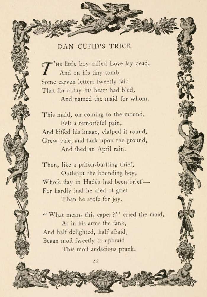 It will be readily apparent that the aim of this volume is to collect the choicest poems on Cupid scattered throughout English literature. A large harvest has been gleaned, and what my judgment counts excellent, so far as practicable, is represented. The attitude towards Cupid has mostly been one of obstinate resistance, but he has the element that wins,—sometimes fantastically, sometimes pathetically. The beleaguering little rogue never quits the field defeated,—to him no suit is hopeless.