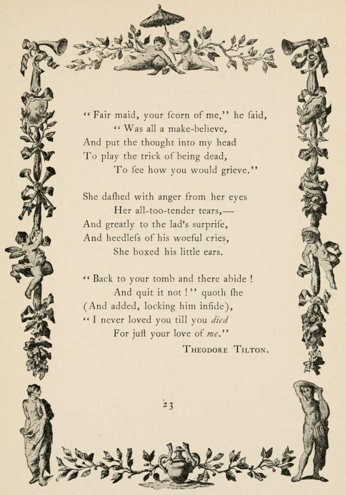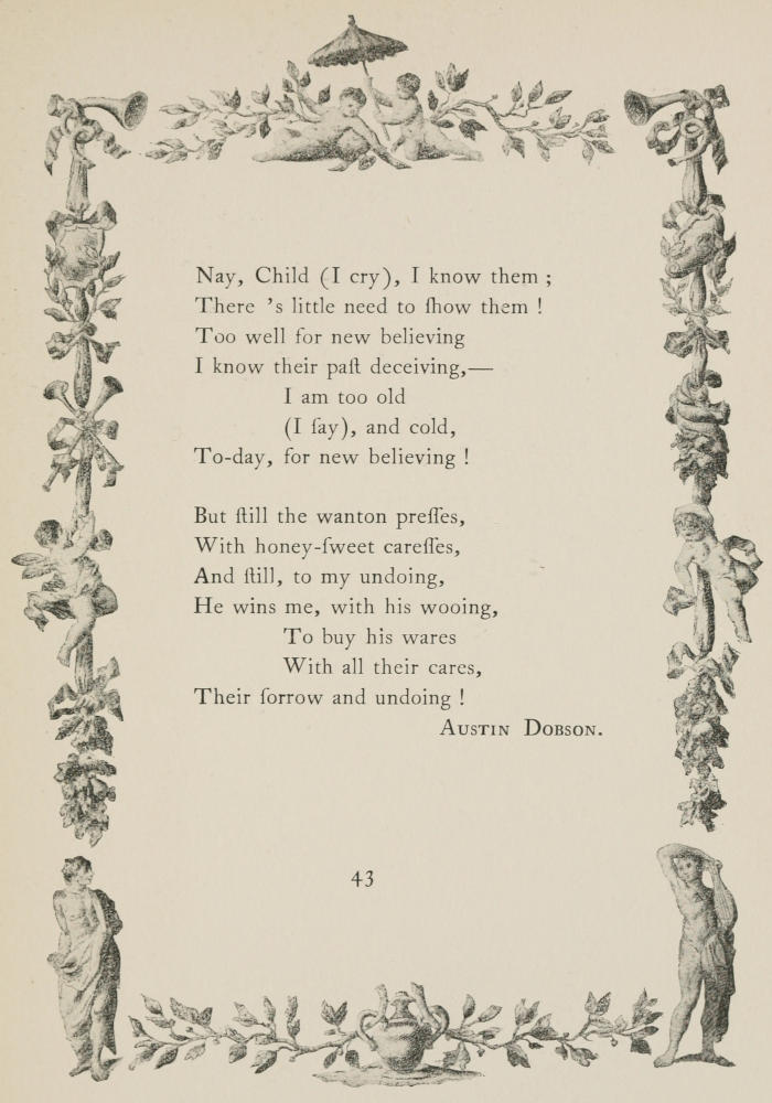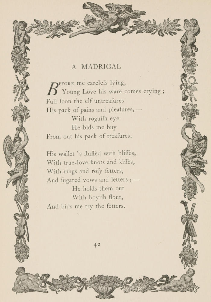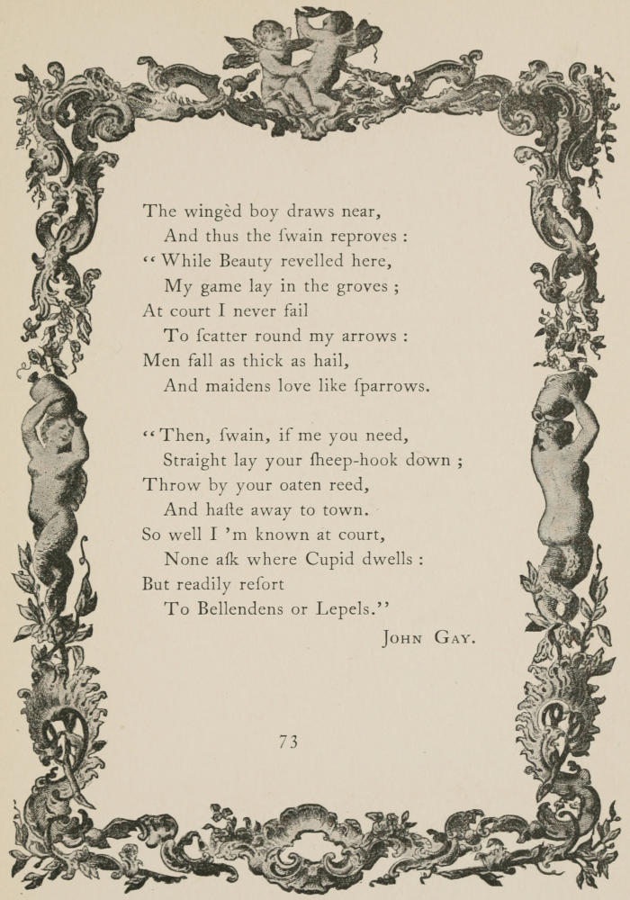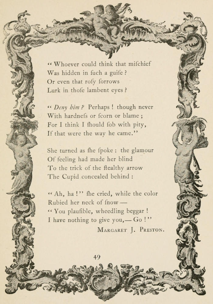 It will be readily apparent that the aim of this volume is to collect the choicest poems on Cupid scattered throughout English literature. A large harvest has been gleaned, and what my judgment counts excellent, so far as practicable, is represented. The attitude towards Cupid has mostly been one of obstinate resistance, but he has the element that wins,—sometimes fantastically, sometimes pathetically. The beleaguering little rogue never quits the field defeated,—to him no suit is hopeless.
